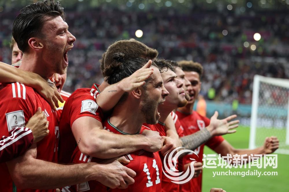 11月21日,威尔士队球员加雷斯·贝尔(中)与队友在比赛中庆祝进球。 当日,在卡塔尔多哈艾哈迈德·本·阿里体育场进行的2022卡塔尔世界杯足球赛B组比赛中,美国队以1比1战平威尔士队。新华社记者 潘昱龙 摄