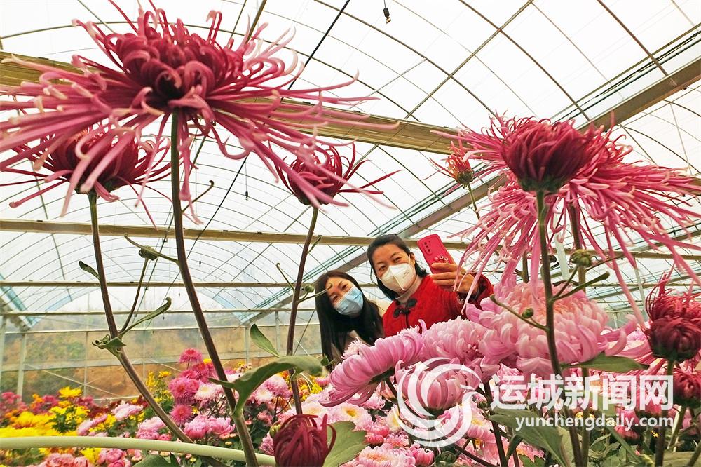 ▲11月21日,村民和游客在新绛县泽掌镇光村新建的菊花观赏园赏菊拍照。