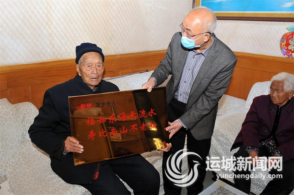 运城晚报讯(记者 朱超逸丁)为进一步弘扬中华民族敬老、爱老、助老的传统美德,在全社会倡导敬老、养老、助老的社会新风尚,连日来,万荣县卫生健康和体育局党组成员郝春生带领工作人员,走访慰问了该县15位百岁老人,代表党和政府向百岁老人表达了亲切慰问和诚挚祝福,送去了由省人民政府颁发的写有“福如东海长流水 寿比南山不老松”的牌匾(下图)。