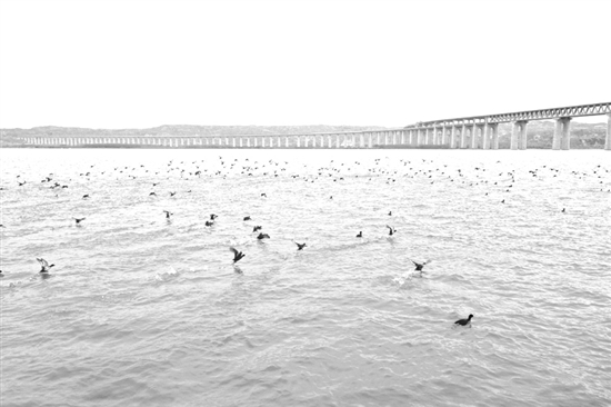 11月30日,在黄河三门峡水库陕州区段,成群的水鸟在湖面上栖息、觅食,构成一幅和谐美丽的生态画卷。 记者 王建栋 摄
