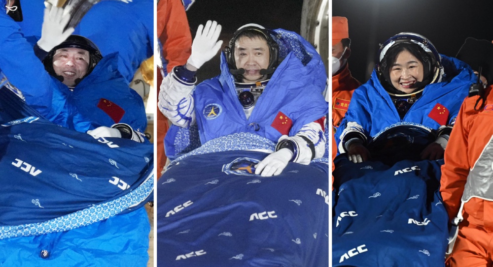 12月4日,神舟十四号载人飞船返回舱在东风着陆场成功着陆。这是航天员陈冬(中)、刘洋(右)、蔡旭哲安全顺利出舱。 新华社发