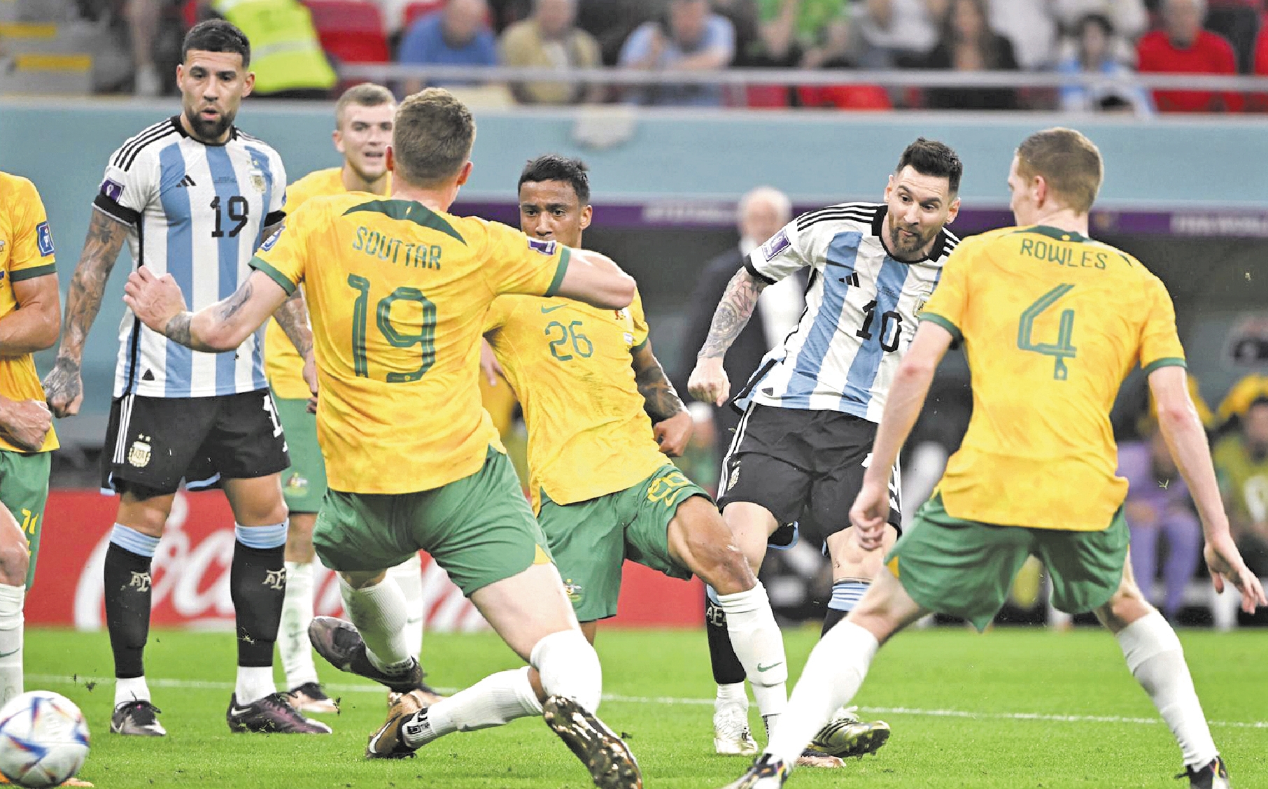 随后登场的梅西,在他熟悉的位置打入了个人世界杯淘汰赛的首个入球。在这场个人职业生涯第1000场比赛中,梅西带领阿根廷队以2:1战胜澳大利亚队,晋级八强。