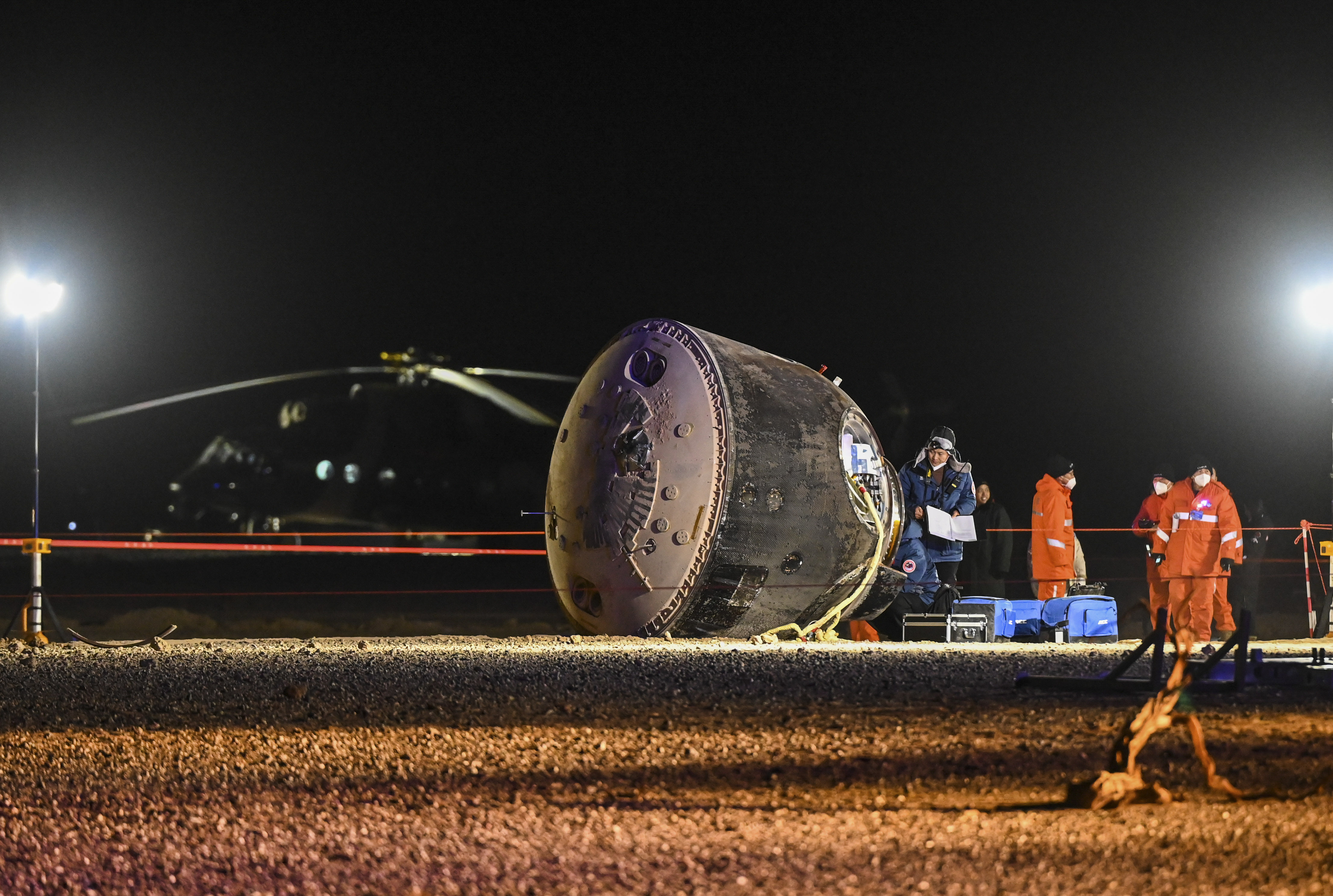▲12月4日20时09分,神舟十四号载人飞船返回舱在东风着陆场成功着陆,现场医监医保人员确认航天员陈冬、刘洋、蔡旭哲身体状态良好。 新华社记者 连振 摄
