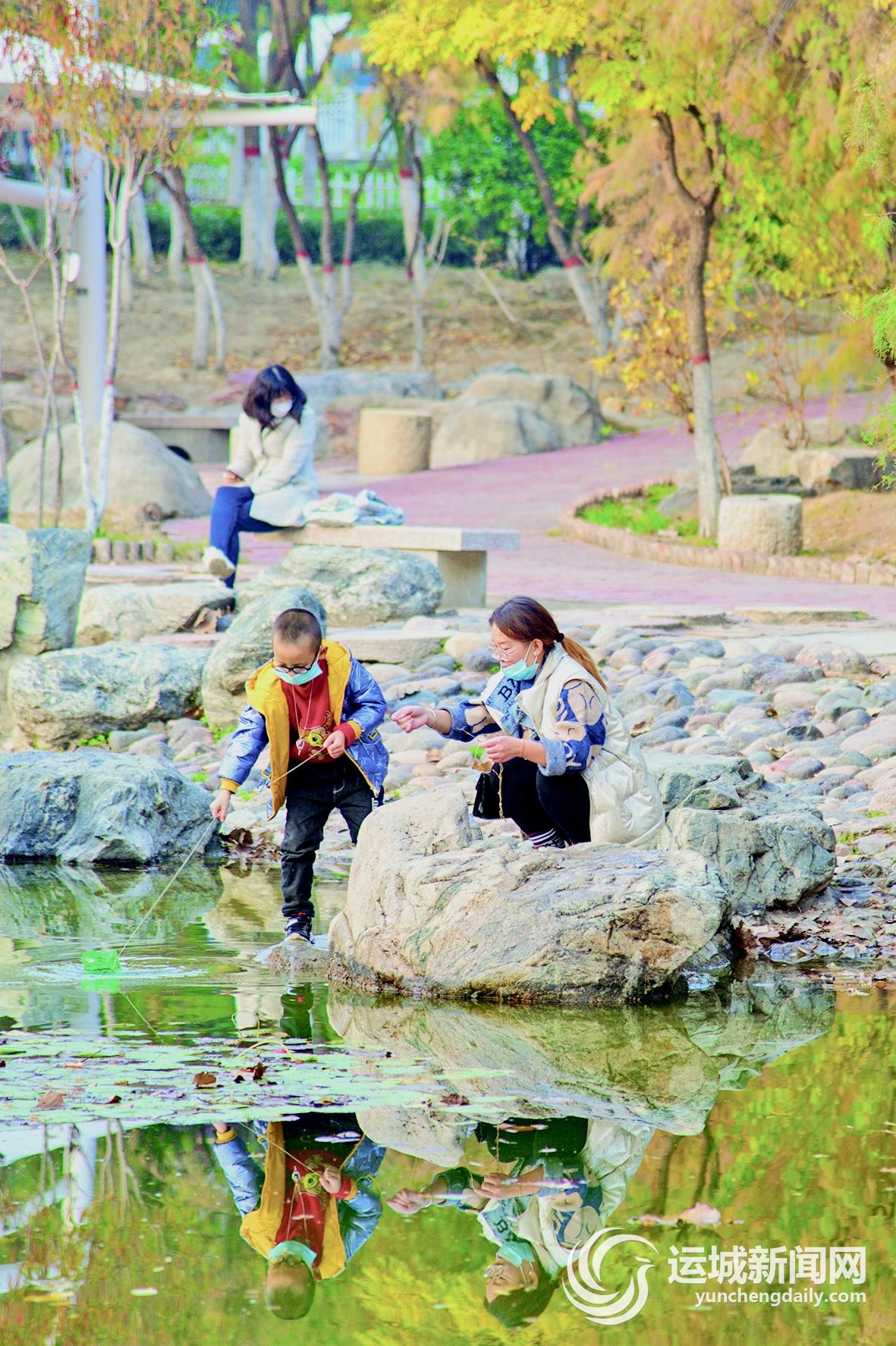 眼下的禹都公园美景别致,这儿一片黄,那儿一片绿,黄的是树,绿的是湖。湖上泛着一片青烟似的薄雾,静美的秋叶落在水面,顺着水流旋成美妙的舞者。有鸟儿被这舞者吸引,挥动着翅膀从湖面飞过,湖水笼罩在阳光之下宛若春华。有父母带着孩子在湖边看野鸭戏水,入眼便是一幅醉人心扉的冬日画卷。