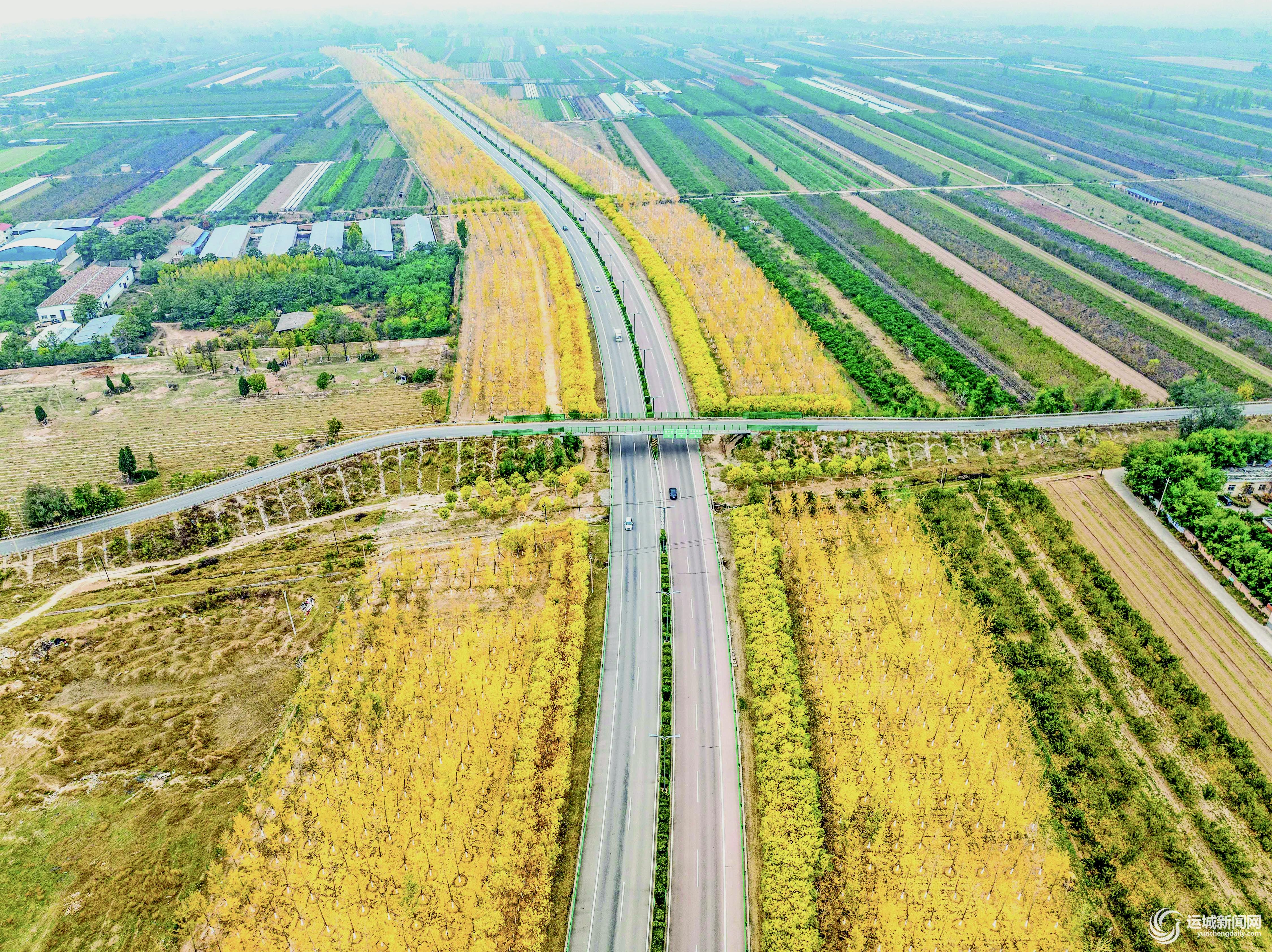 运城高速西连接线两侧的银杏和金枝槐已经由绿转黄,放眼望去,金黄满地,微风一扫,树叶如黄蝶纷飞,这条路便有了童话般的色彩。