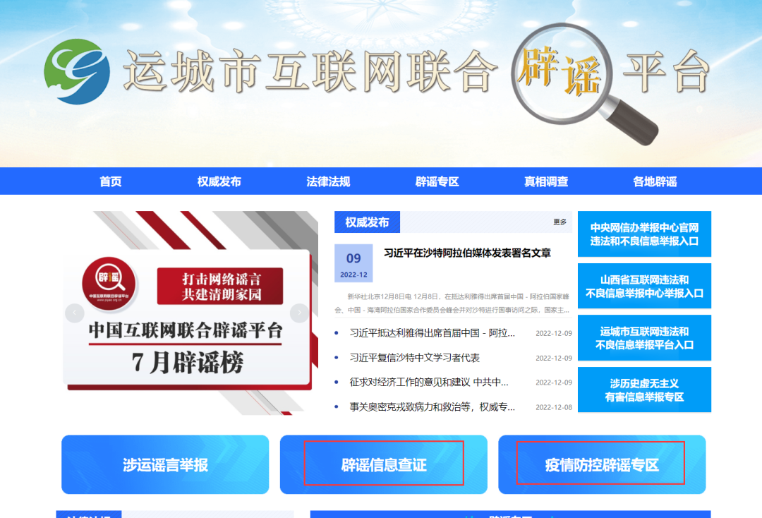 运城市互联网联合辟谣平台,广大网民不仅可以通过该平台举报涉运谣言信息,还能看到近期重要辟谣信息,为广大群众提供一个举报谣言、辨识谣言、了解真相的权威渠道,打造运城市网络辟谣工作主阵地。