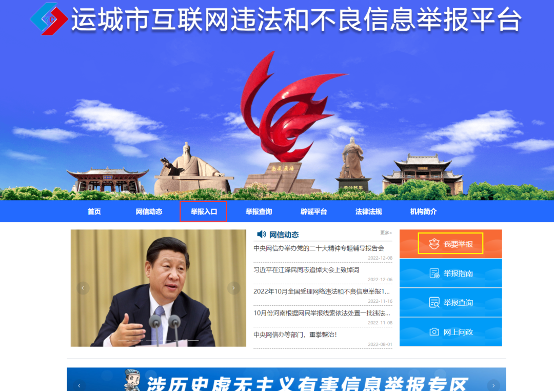 登录运城市互联网违法和不良信息举报平台(http://jubao.ycwxb.cn),在首页菜单栏点击“我要举报”,进入举报页面。或点击上方菜单栏“举报入口”,进入举报页面。
