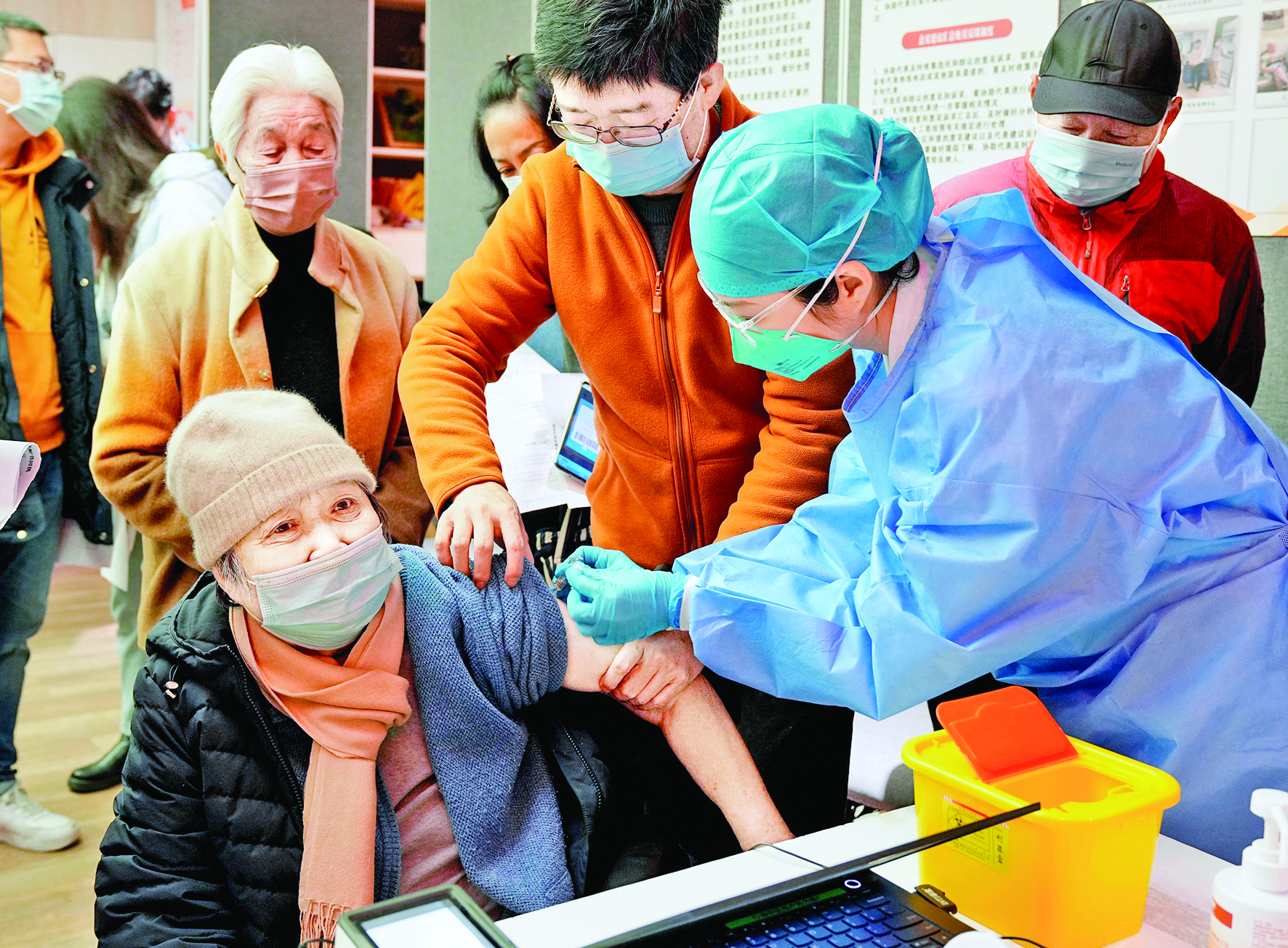 12月9日,接种小分队的护士在上海黄浦区打浦桥街道大同居委会为老年人接种新冠疫苗。