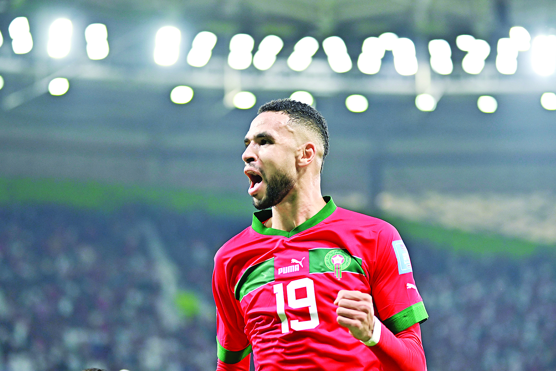 ▲12月10日,摩洛哥队球员恩内斯里在比赛中进球后庆祝。新华社记者 肖艺九 摄
