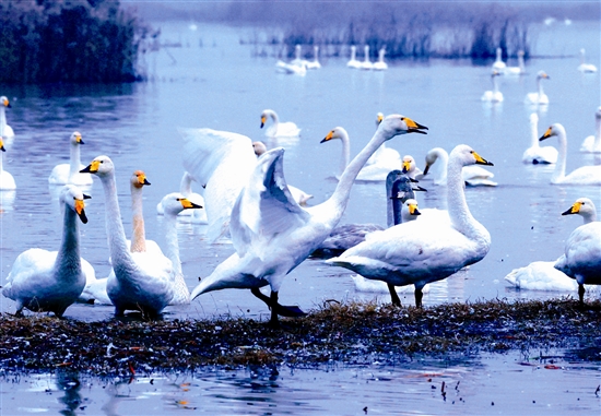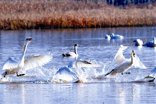 12月8日,黄河湿地灵宝段,成群结队的白天鹅在此嬉戏觅食,成为冬日黄河岸边一道亮丽的风景线。 席竹婷 摄
