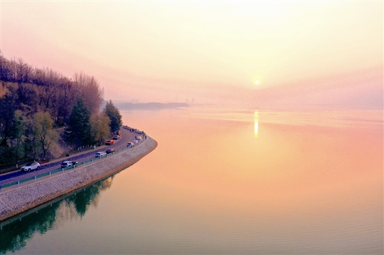 12月9日傍晚,余晖下的三门峡百里黄河生态廊道陕州区段美景如画。