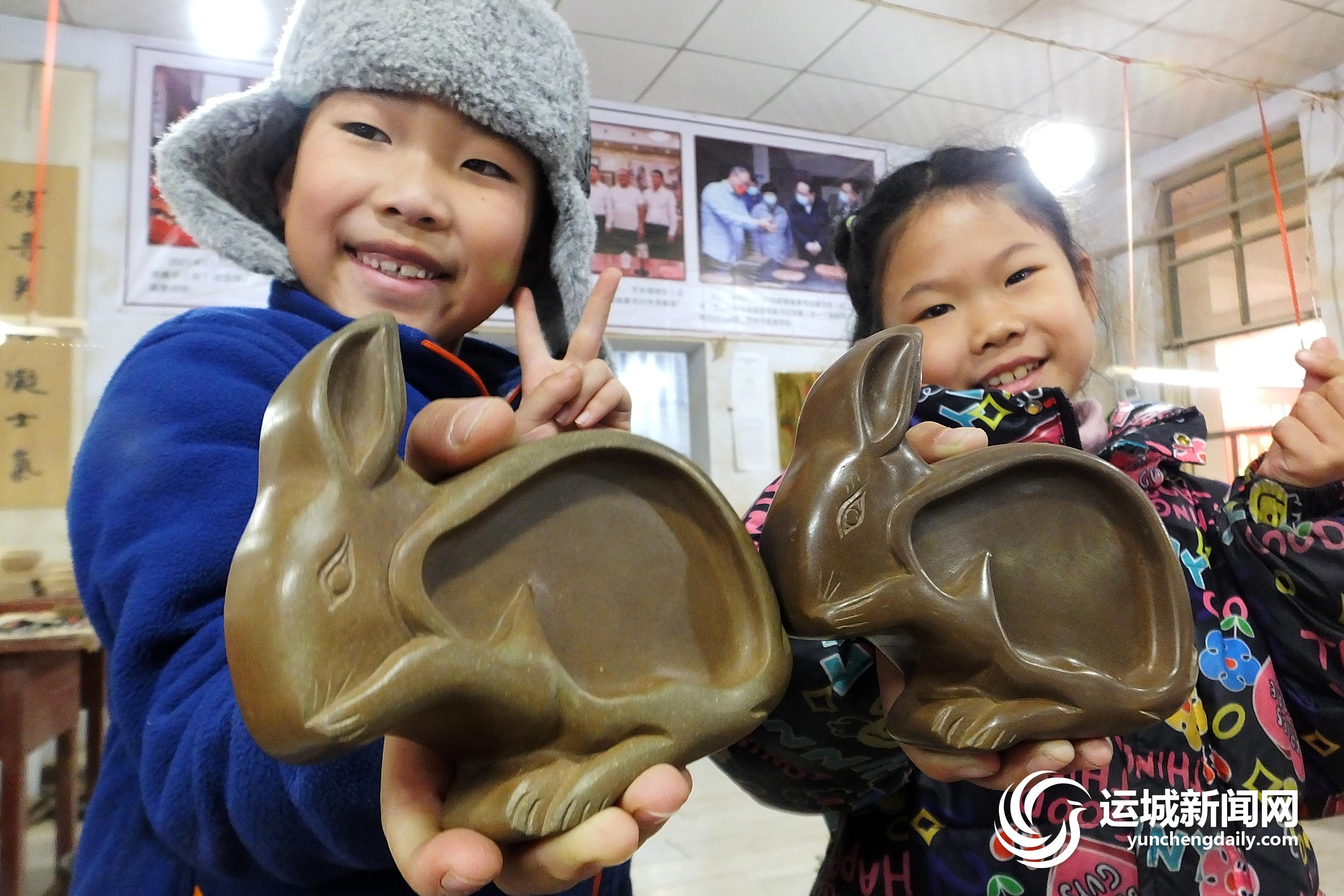 图为两名小朋友手捧兔年系列绛州澄泥砚在拍照。特约摄影 高新生 摄