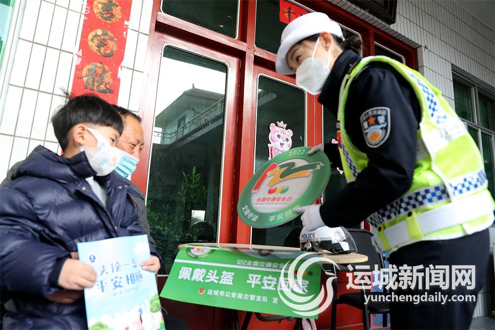 运城晚报讯 为进一步增强广大农村群众的交通法规意识、安全意识、文明意识,消除冬季恶劣天气变化给道路交通安全带来的隐患,12月21日,市公安局盐湖分局交警大队宣传科民辅警深入辖区龙居镇雷家坡、杜家坡等村庄,开展“美丽乡村行”“122冬季交通安全宣传”活动。