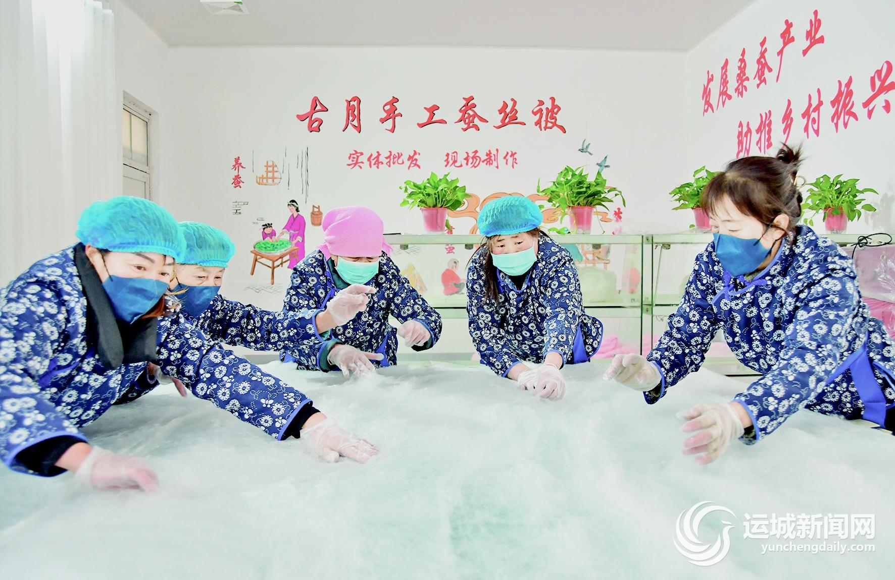 12月17日,芮城县古月农业开发有限公司员工在加工蚕丝被。 该公司以阳城镇永丰村为基地,在该县西陌等乡镇发展桑蚕产业,现参与农户70余家,种植桑树600余亩,带动周边县市种植桑树4000余亩,每年可为农户增加收入240万余元。