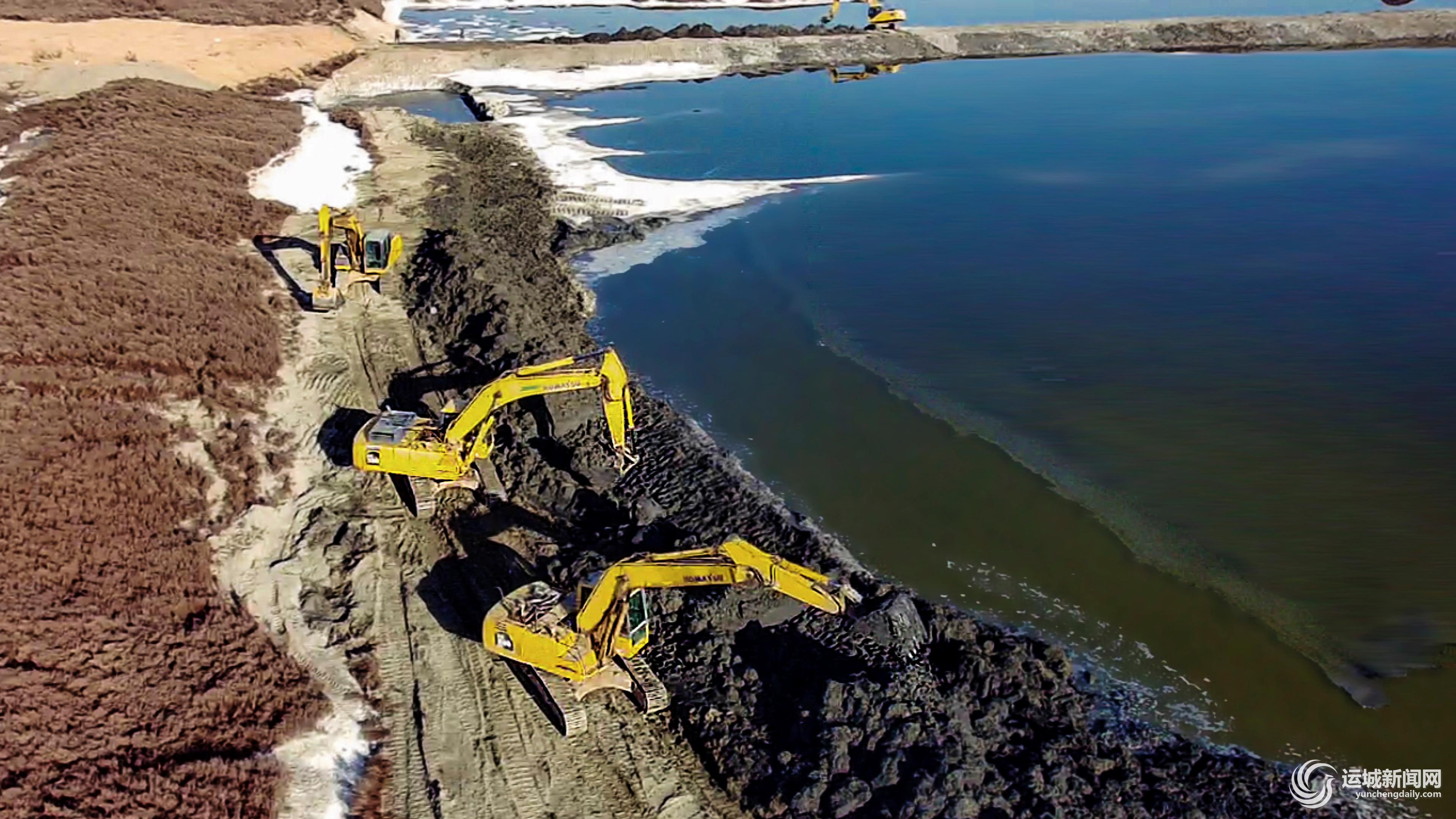 近日,施工人员操作机械在盐湖景区内实施堤埝除险加固工程。有4000多年开发历史的盐湖景区从2021年8月份开始实施生态修复工程,一期修复工程包括堤埝除险加固、江道治理、生态修复等及修建配套设施。工程完工后,美丽盐湖将成为一道更加亮丽的城市风景线和旅游地标。 特约摄影 姜 桦 摄