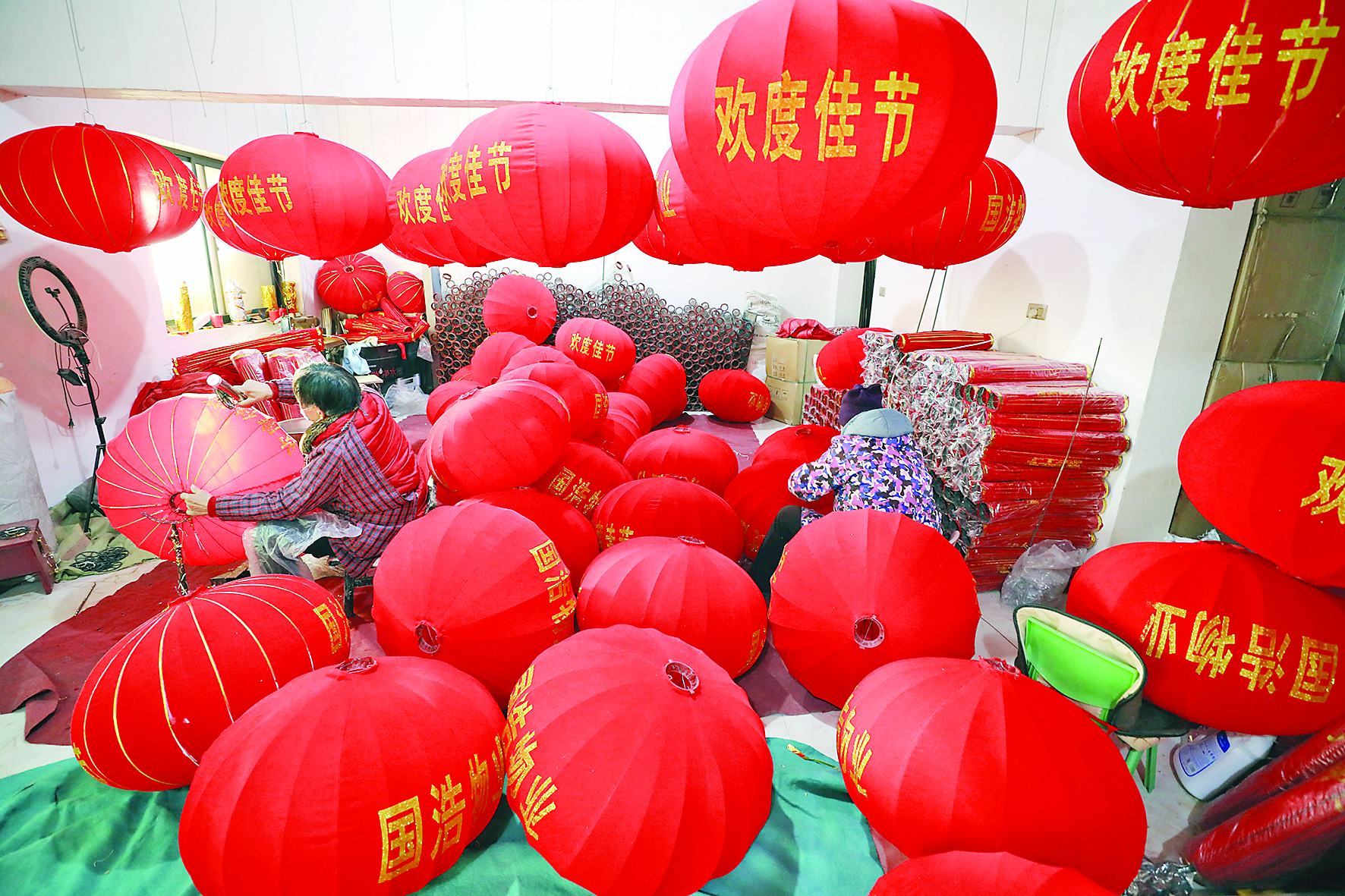 12月27日,在焦作市温县北冷乡许北张村一家灯笼作坊,村民在赶制大红灯笼。 新年临近,河南省焦作市温县北冷乡许北张村灯笼作坊内一派忙碌景象,村民们加紧赶制大红灯笼,供应节日市场。 新华社发(徐宏星 摄)