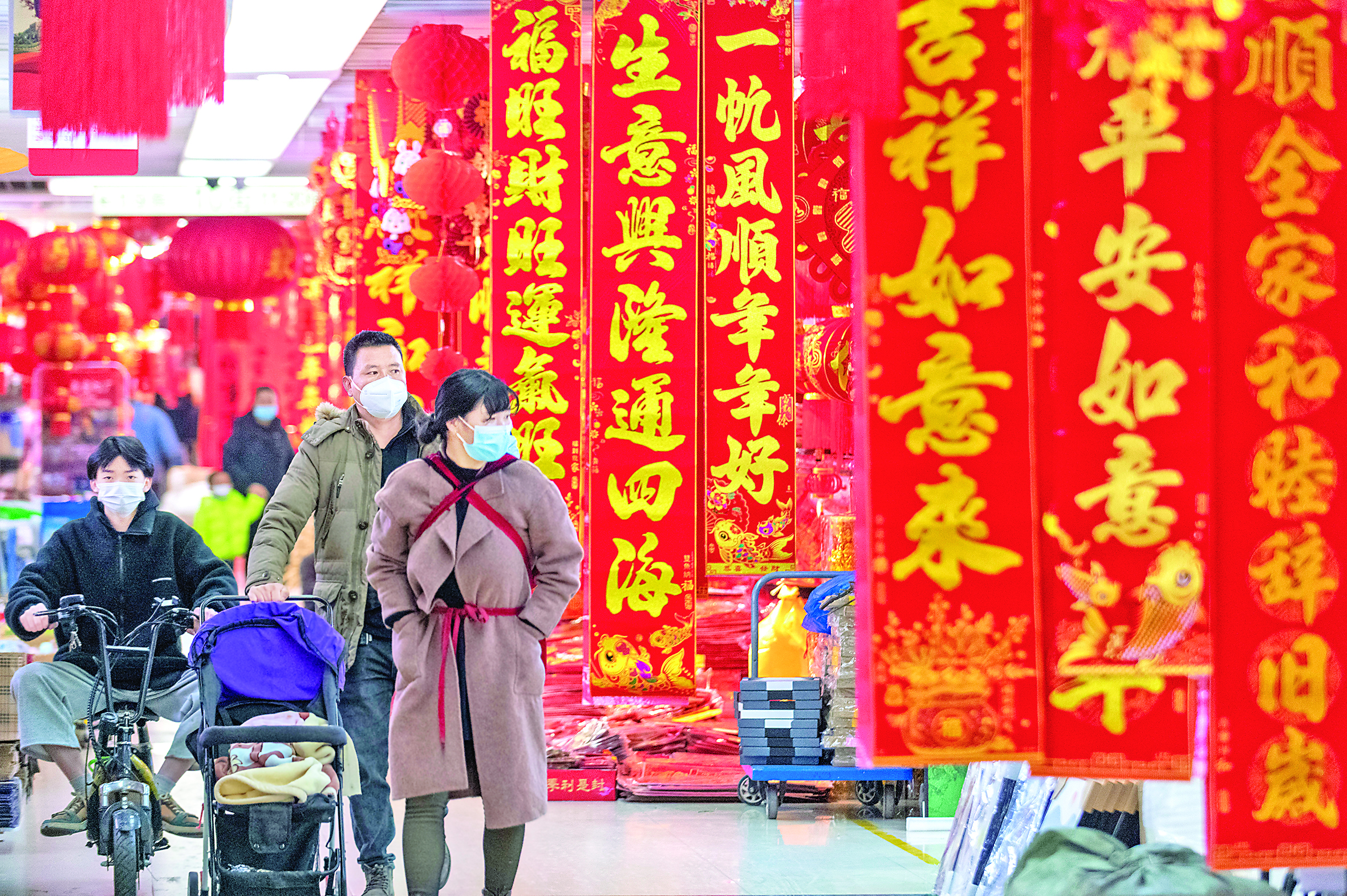 2022年12月31日,顾客在昆明新螺蛳湾国际商贸城内选购节庆用品。 近期,位于云南省昆明市的新螺蛳湾国际商贸城内节日饰品购销两旺,红灯笼、春联、兔年生肖饰品等销售逐渐升温。新华社记者 陈欣波 摄