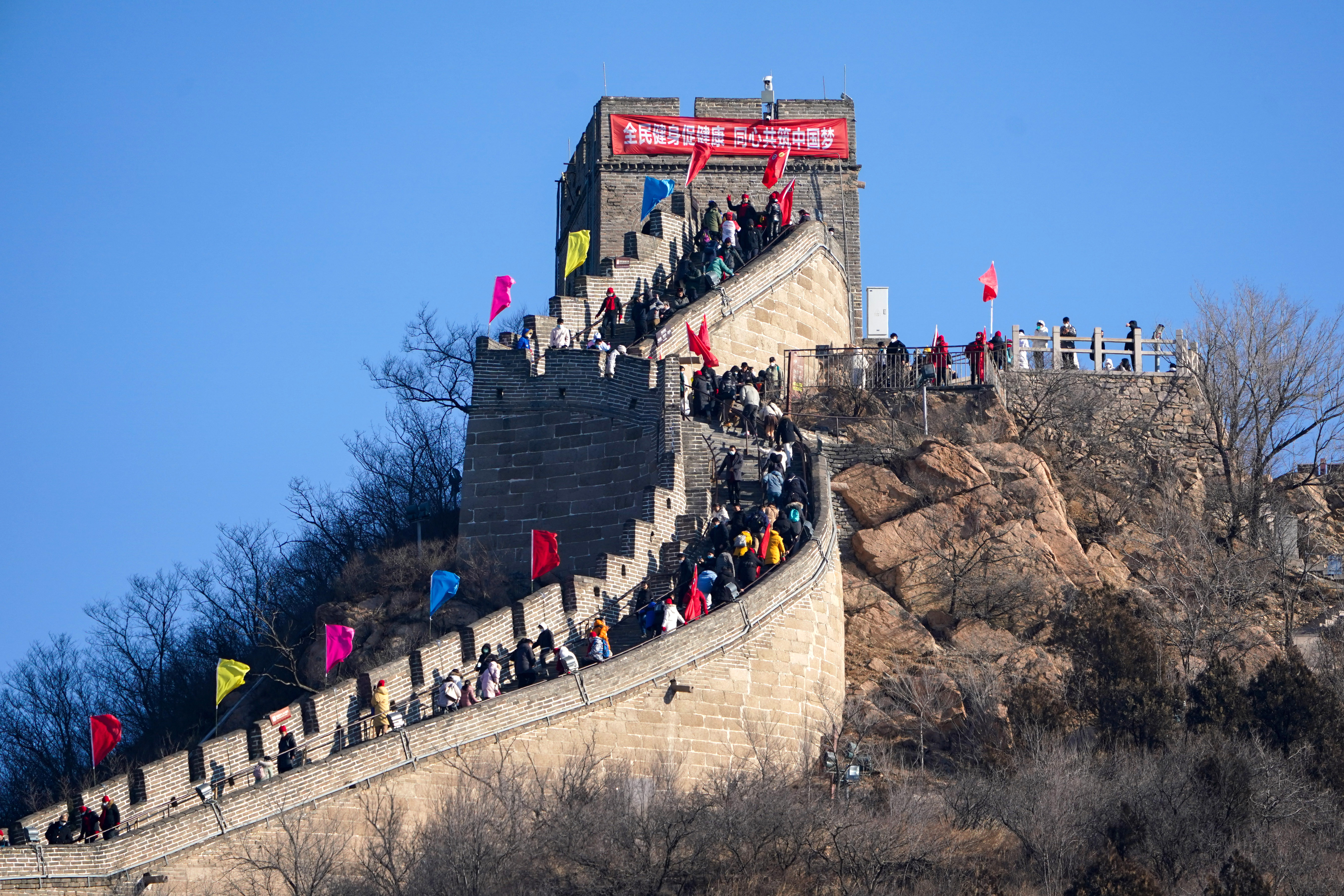 当日,2023年全国新年登高健身大会北京会场活动在八达岭长城举行,300余名市民代表和众多游客一起,登高望远,健身祈福,庆祝新年。