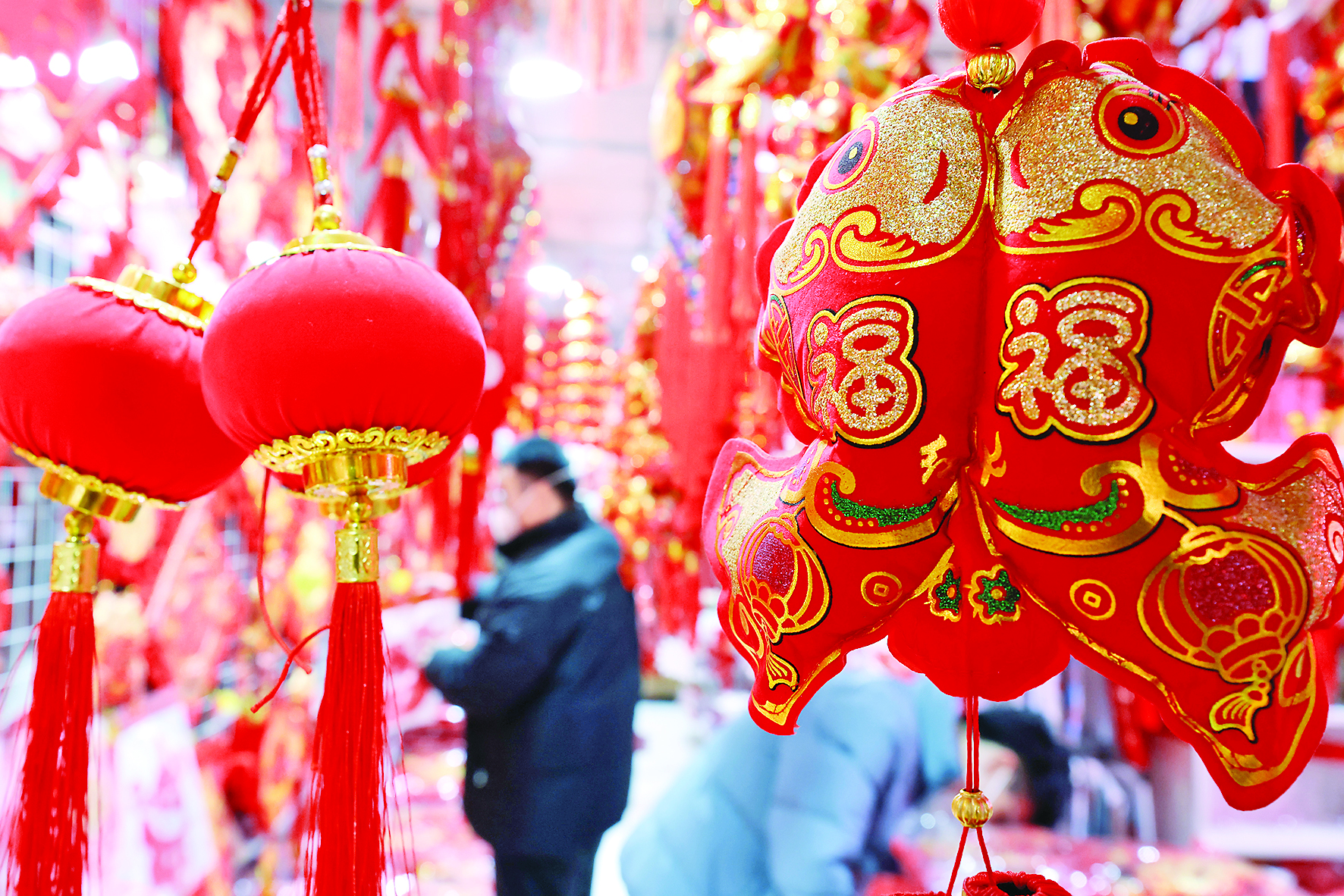 1月1日,人们在山东省枣庄市一处年货市场选购新年饰品。 元旦假期,消费市场有序恢复发展。新华社发