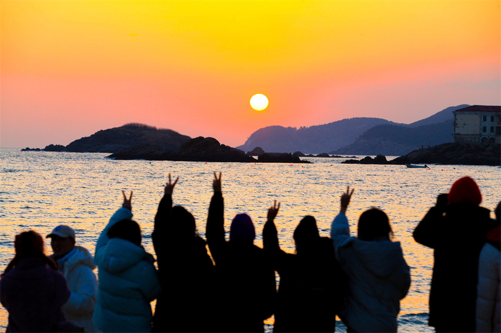1月1日,在山东省威海市半月湾海水浴场,游客在海滩上观看日出。日月其迈,岁律更新。人们在新年的第一缕阳光中,迎接2023年的到来。
