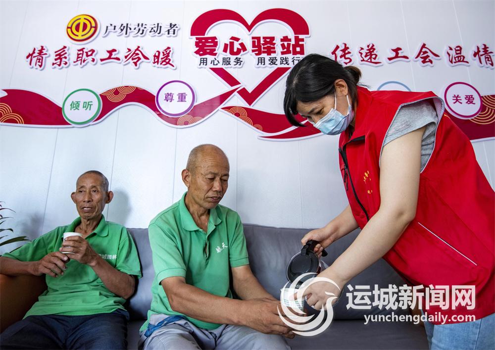 户外工作者在中心城区爱心驿站休闲纳凉