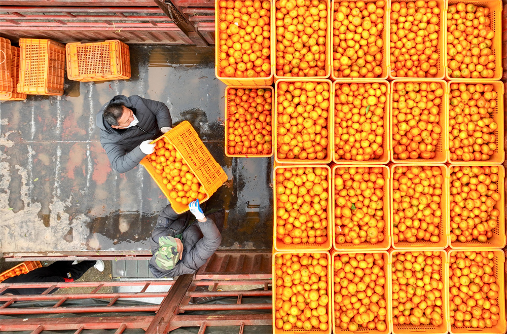 1月3日,在湖南省永州市道县清塘镇尹家村真秀农业果园基地,农民在装运柑橘。新华社发(蒋克青 摄)