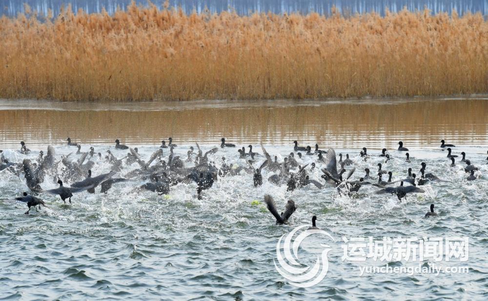 1月3日,国家二级保护动物白骨顶鸡在稷山县杨赵村汾河东滩嬉戏。