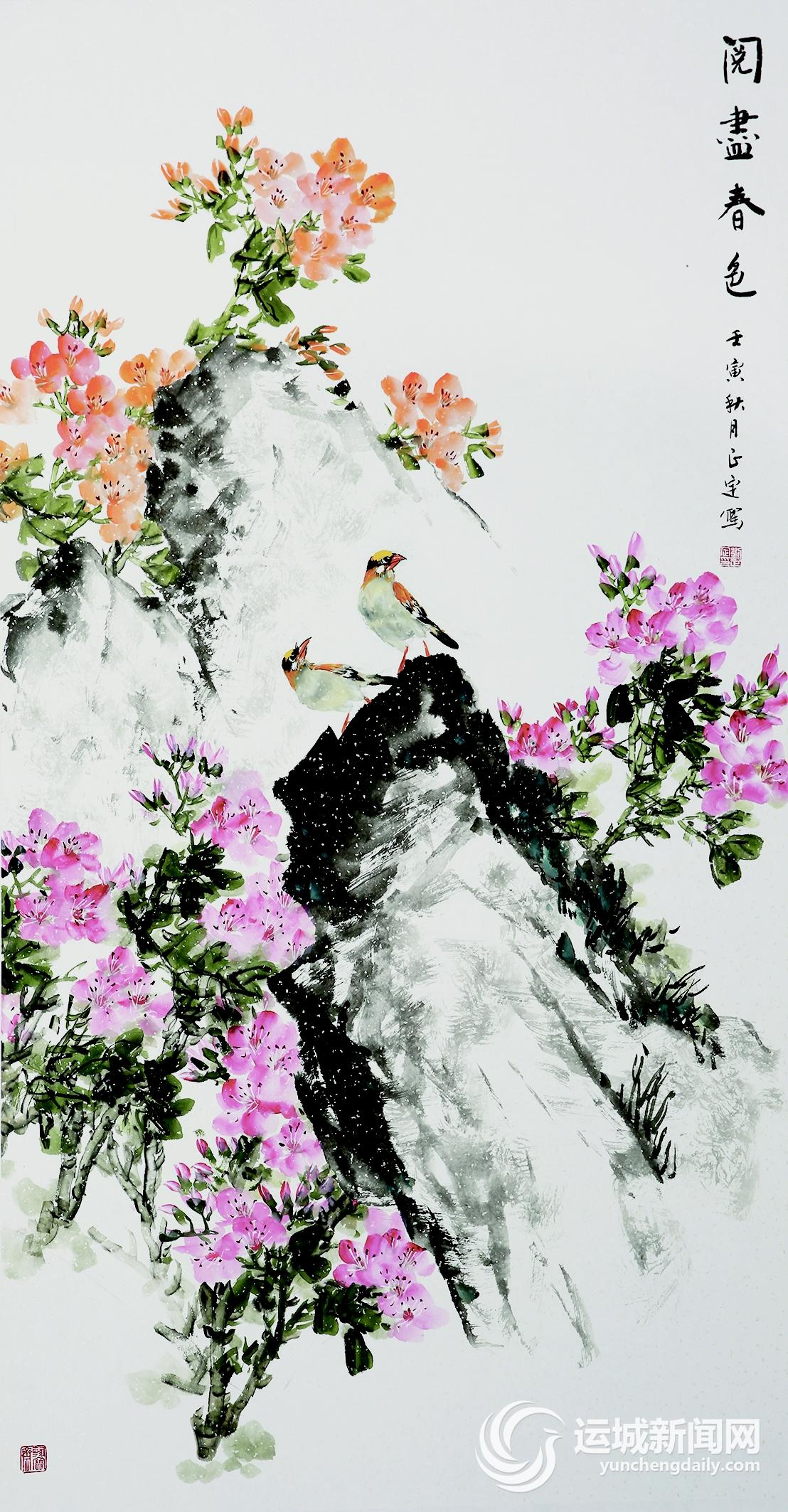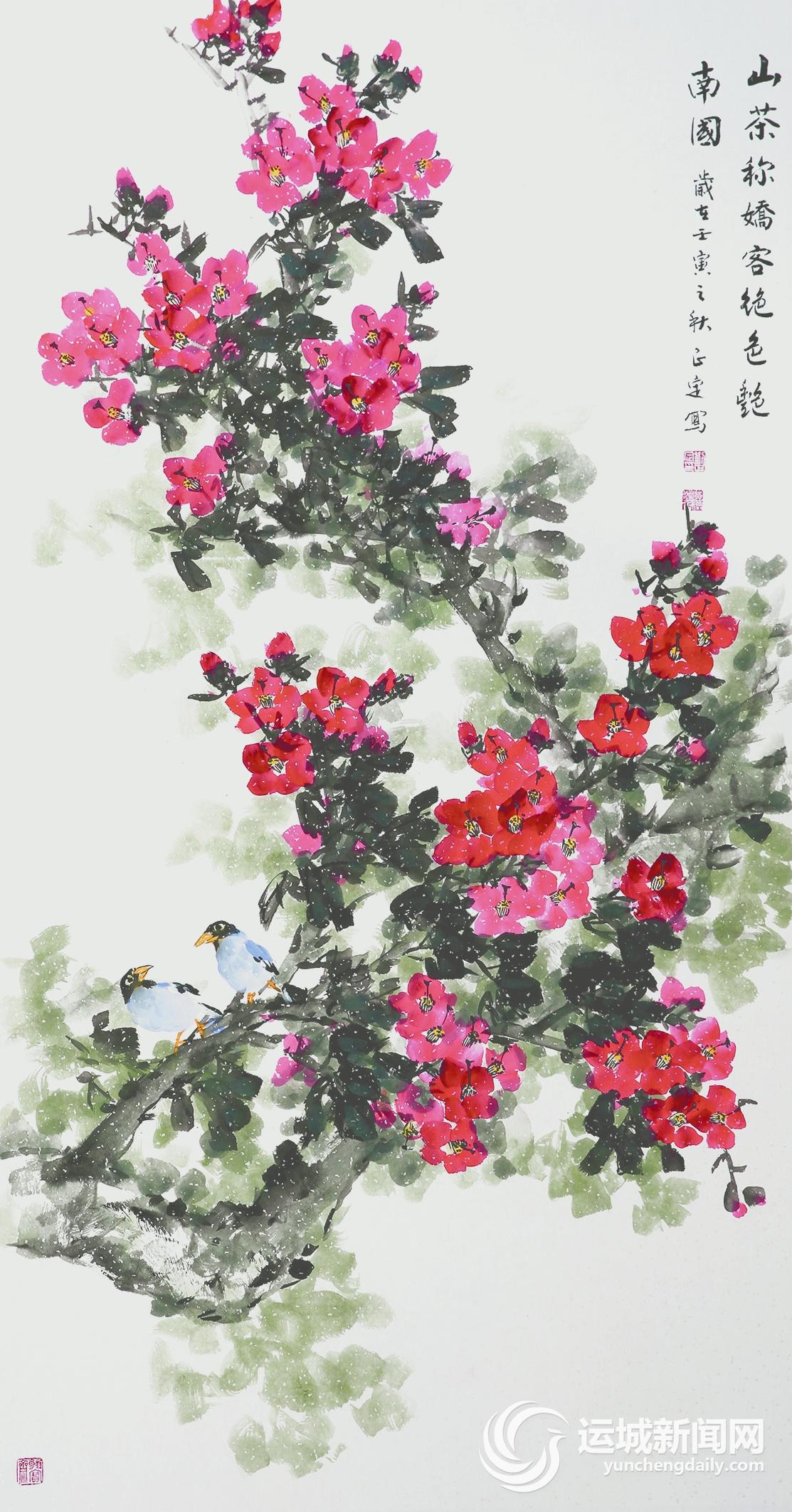 读正定先生的花鸟画,便可窥视到他的人生档案和生命华彩。他画中的小鸡、山雀、水鸭、飞燕……都是那样轻盈灵巧、矫健敏捷、活泼可爱。他笔下的石榴、荔枝、山楂、海棠等都是那样鲜美水灵,望而生津。他展现的玉兰、秋菊、凌霄、紫藤等都是那样清雅艳丽、馨香迷人。他的牡丹图有白梅和红梅之分,红梅犹如他的生命激情,热烈奔放;白梅好似他的道德坚守,冰清玉洁。