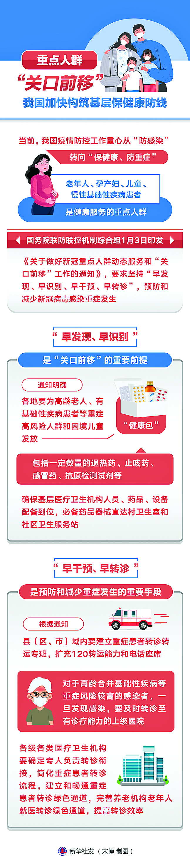 新华社北京1月4日电(记者 顾天成 李恒)当前,我国疫情防控工作重心从“防感染”转向“保健康、防重症”,老年人、孕产妇、儿童、慢性基础性疾病患者是健康服务的重点人群。国务院联防联控机制综合组1月3日印发《关于做好新冠重点人群动态服务和“关口前移”工作的通知》,要求坚持“早发现、早识别、早干预、早转诊”,预防和减少新冠病毒感染重症发生。