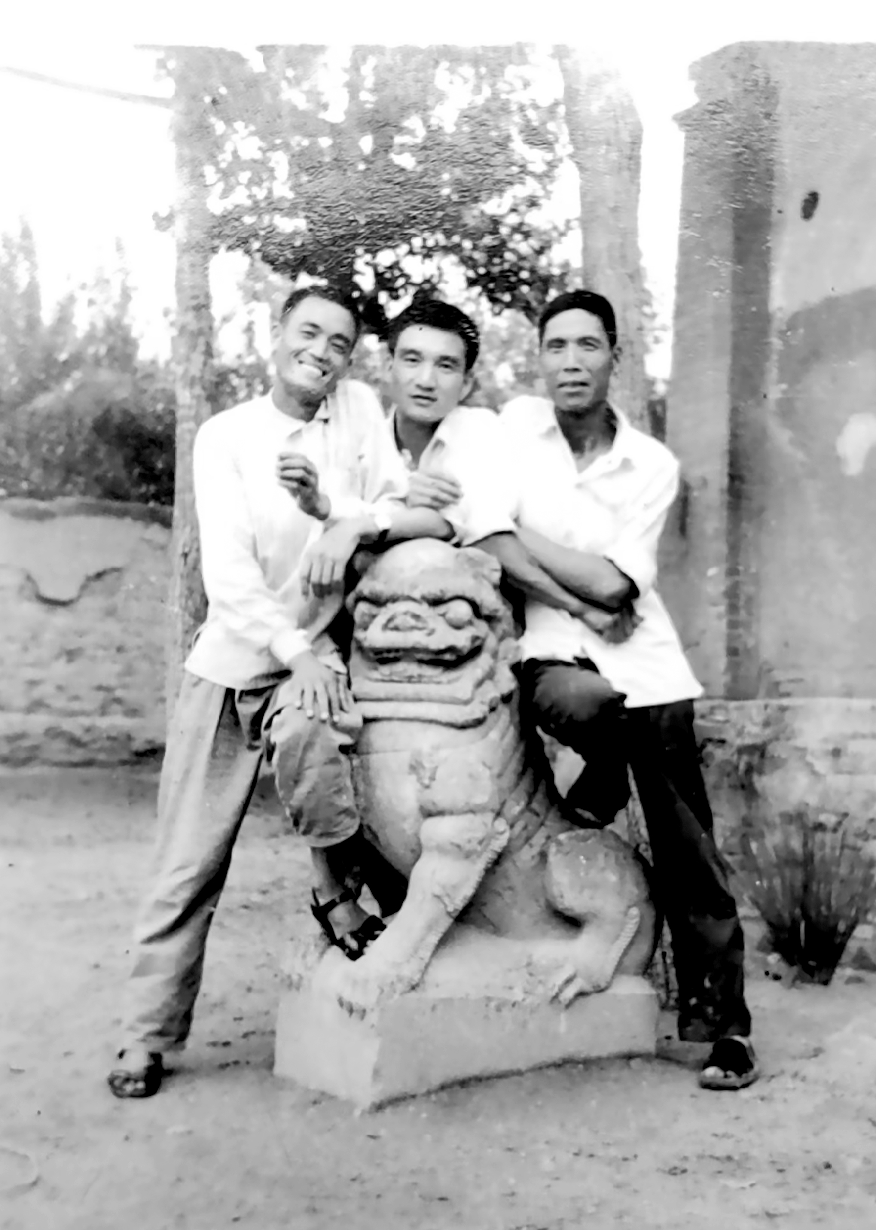 戏场北边有一个五级门坡通往献殿,门坡两侧有石狮一对,左雄右雌,由底座、中节和狮体结构而成,通体高约6尺。雄狮口含丝带,右前腿高抬,爪下踩绣球一枚。雌狮两前腿间卧小狮一只,呈仰望状;背上又驮小狮一只,憨态可掬。雄雌两狮皆为仰首后蹲状,相互侧望,含情脉脉,威风凛凛。后来献殿拆迁时,将石狮迁至大队门口。1982年村西新学校建成后,又将其移至新校教学楼前。再后来,这对石狮被运往金井,安放在公社院内,并对石狮进行了彩绘,使之更为光彩照人。不久,大家又自发组织起来从公社将石狮要回,复又安放在教学楼前。不料经此一番折腾,这对精美雄伟、饱受迁移之苦的石狮却引起了盗贼的注意。在一个月黑风高之夜,大胆盗贼竟放倒校园西边一堵土墙,将狮体从缺口处盗走,至今下落不明,实在令人气愤难忍。