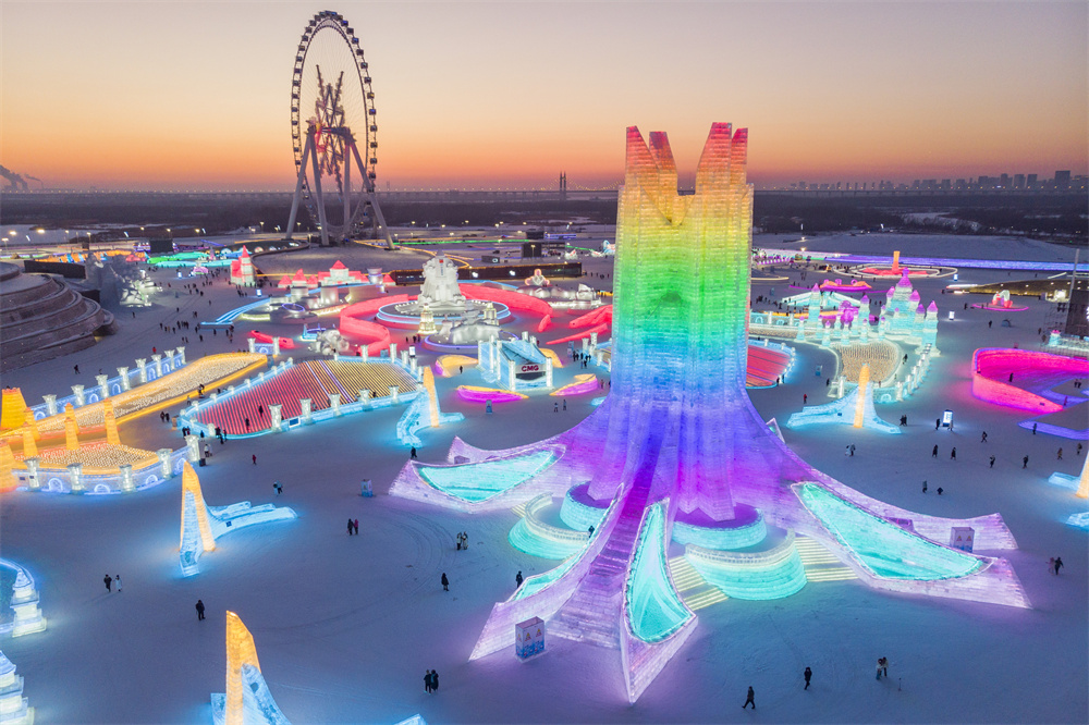 近日,第24届哈尔滨冰雪大世界园区流光溢彩,梦幻壮观,来自天南海北的游客在园区内畅享冰情雪趣。新华社记者 谢剑飞 摄