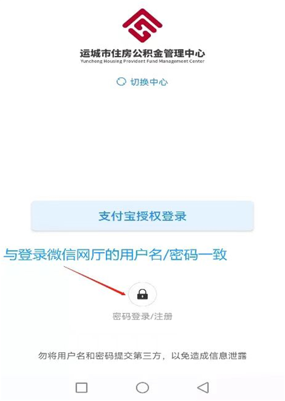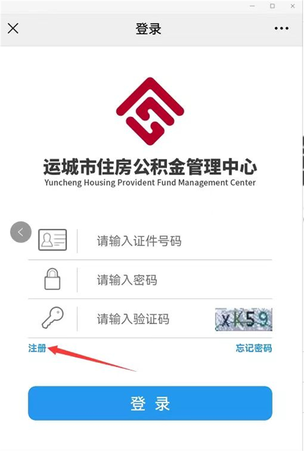 第六步 选择公积金缴存地(运城),点击“个人中心”→“立即登录”(与登录微信网厅的用户名/密码一致)。