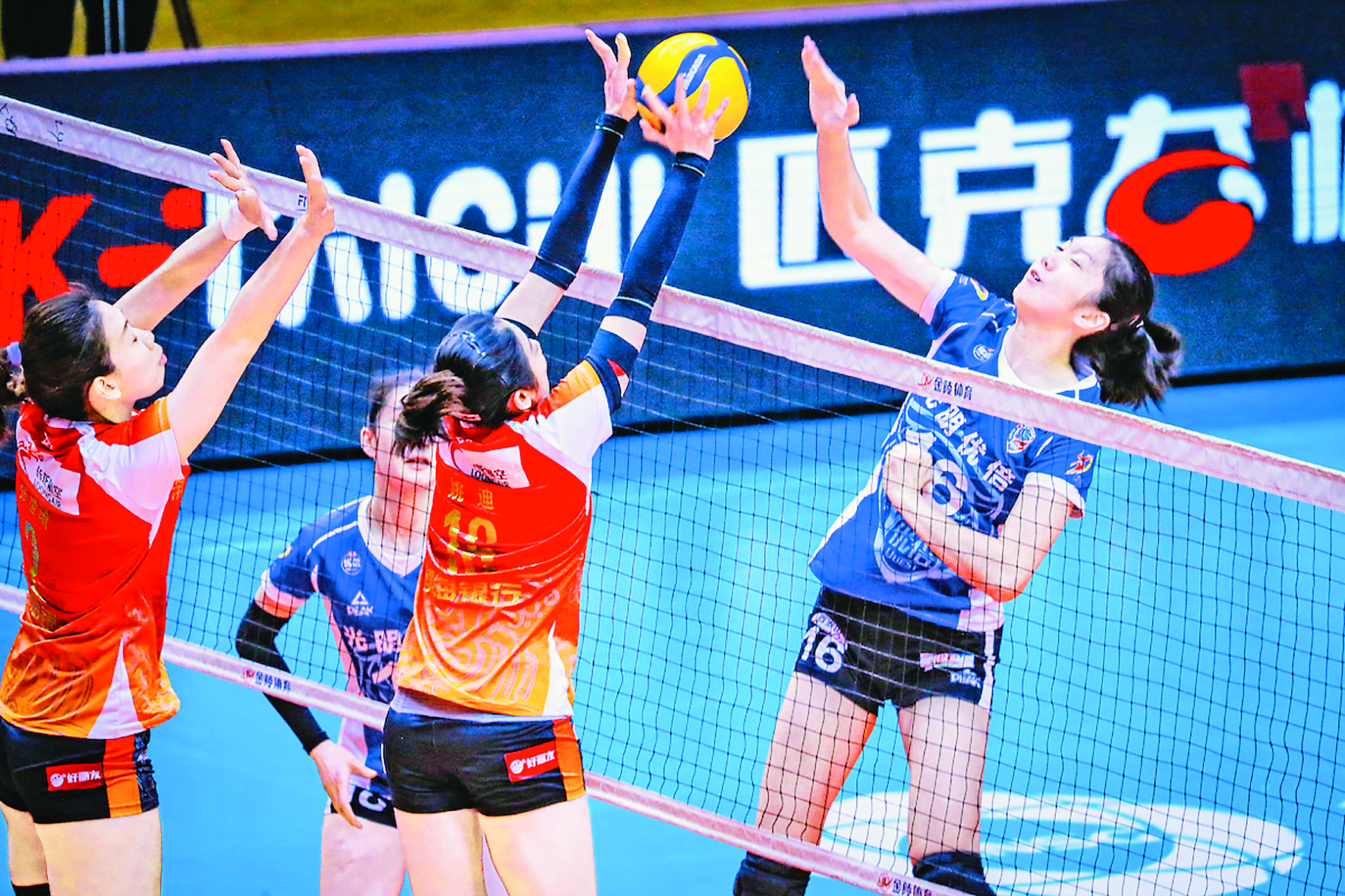 1月8日,上海光明优倍队球员陈厚羽(右一)在比赛中扣球。 当日,在江西上饶举行的2022~2023中国女子排球超级联赛决赛第二场比赛中,天津渤海银行队以3比0战胜上海光明优倍队,从而在三场两胜制的决赛中以总比分2比0夺得联赛冠军。