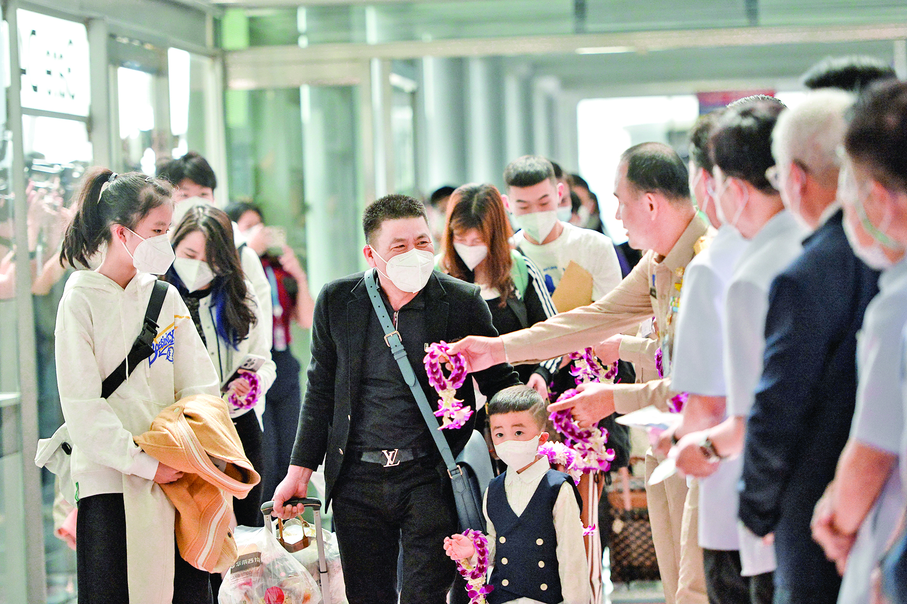 ▲1月9日,泰国官员在位于泰国首都曼谷东郊沙没巴干府的素万那普机场欢迎搭乘厦门航空MF833的旅客。 当日,泰国素万那普机场举行仪式欢迎中国出入境政策调整后首个中国赴泰国航班旅客,泰国副总理兼卫生部长阿努廷到现场迎接。该航班来自厦门,共搭载269名旅客。