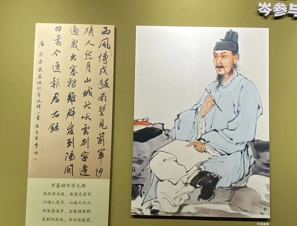 ▲新疆博物馆“共有的家园——铸牢中华民族共同体意识”主题陈列展中的岑参画像和诗词 (资料图)