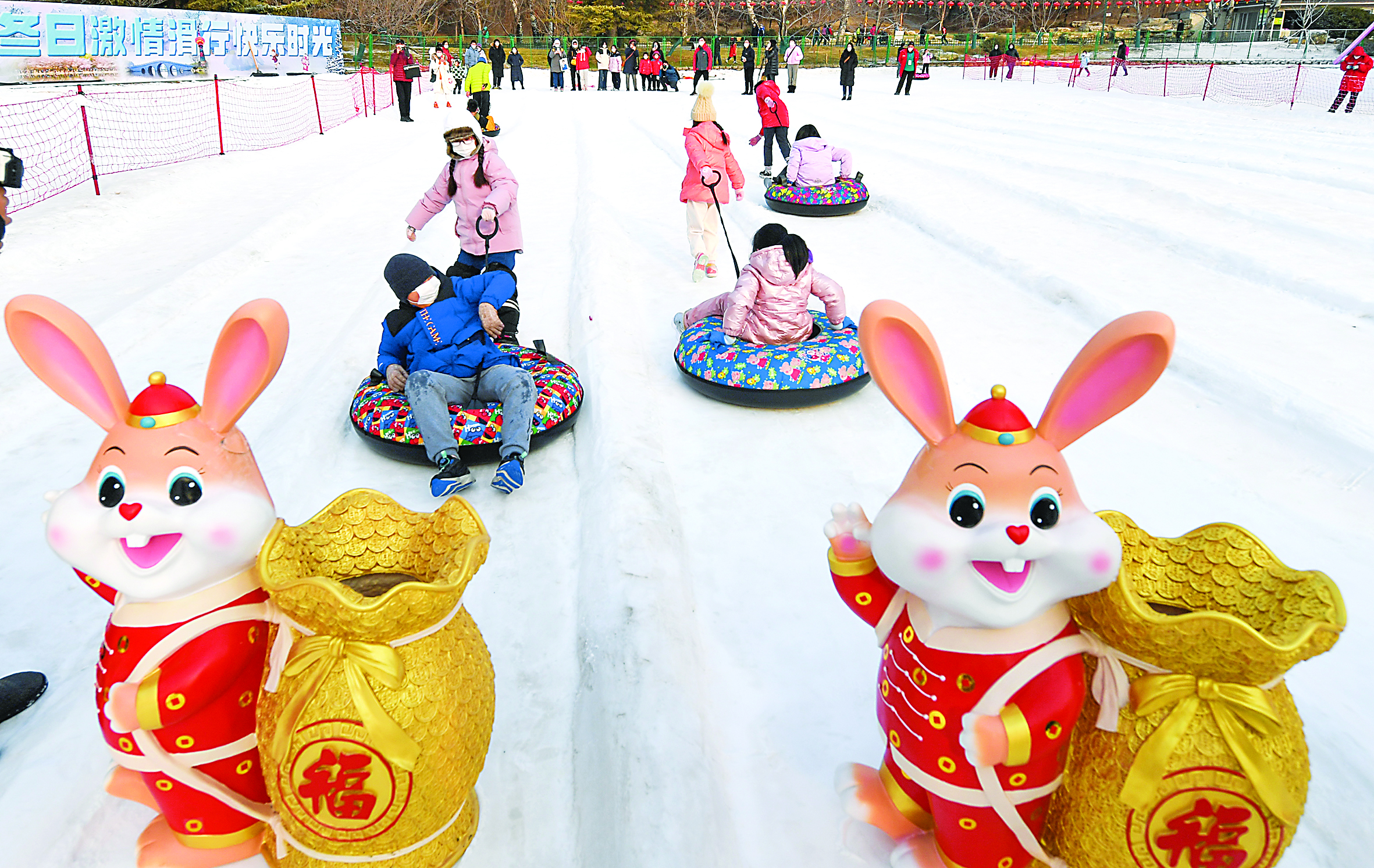 1月11日,孩子们在进行雪圈折返跑接力比赛。当日,一场别开生面的雪地运动会在北京玉渊潭公园雪上乐园举行。游人们参与雪地同心鼓、雪地龙舟等趣味比赛,体验了雪地竞技的乐趣。 新华社记者 李俊东 摄