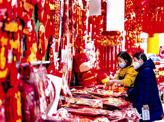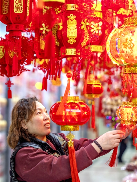 1月10日,市民在市区一商贸城选购春节饰品。随着农历兔年春节日渐临近,我市街头巷尾处处洋溢着浓厚的节日氛围,红灯笼、中国结挂满商铺,贴花、春联等整齐摆放,含有“兔”元素的商品充满喜庆,市民忙着置办年货,红红火火迎新年。