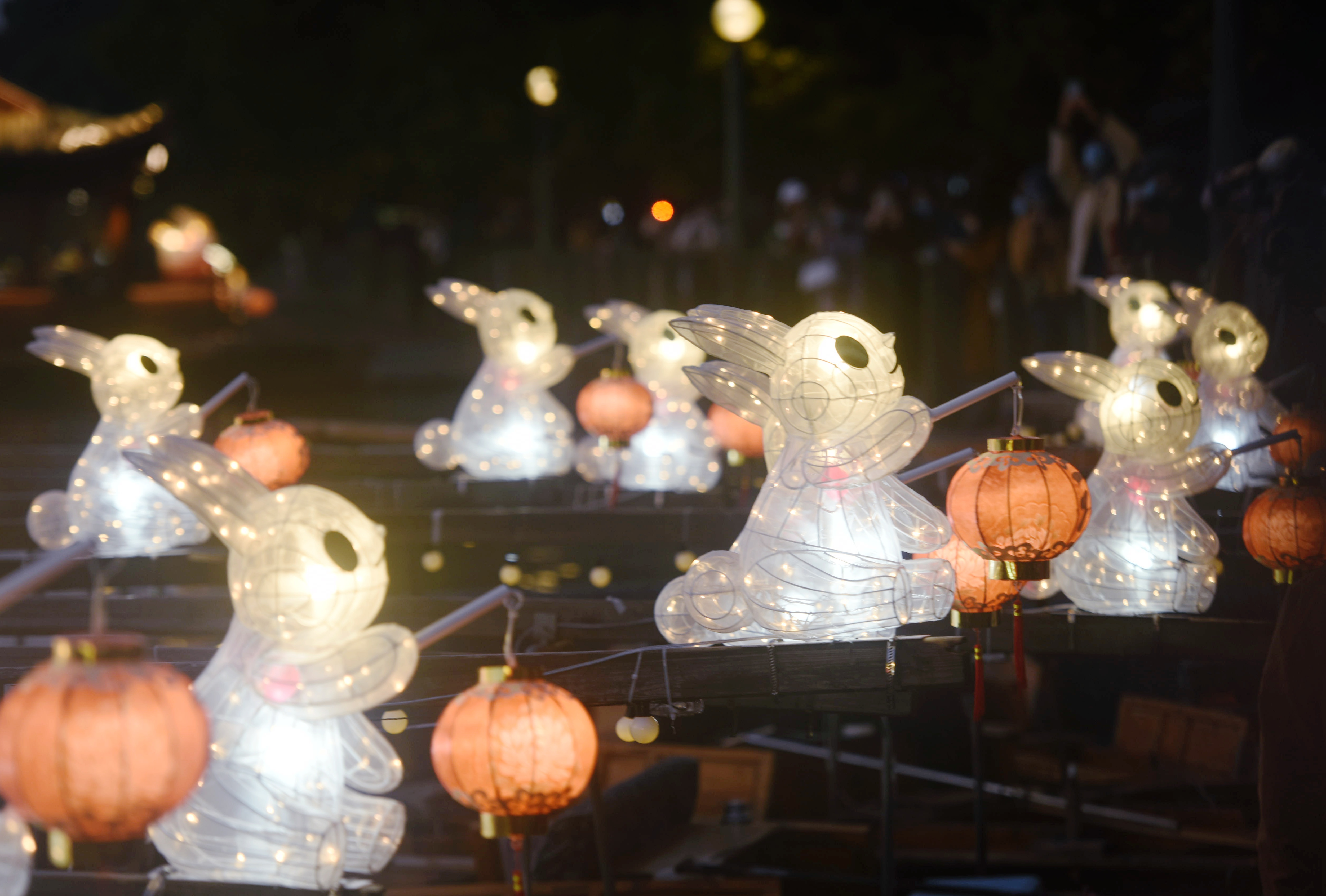 1月11日,装有“玉兔灯”的人力手划船在杭州西湖停泊。 随着农历癸卯兔年临近,日前,30艘装有“玉兔灯”的手划船集中亮相杭州西湖,供市民游客乘坐、赏灯游玩,热热闹闹迎接新春佳节。