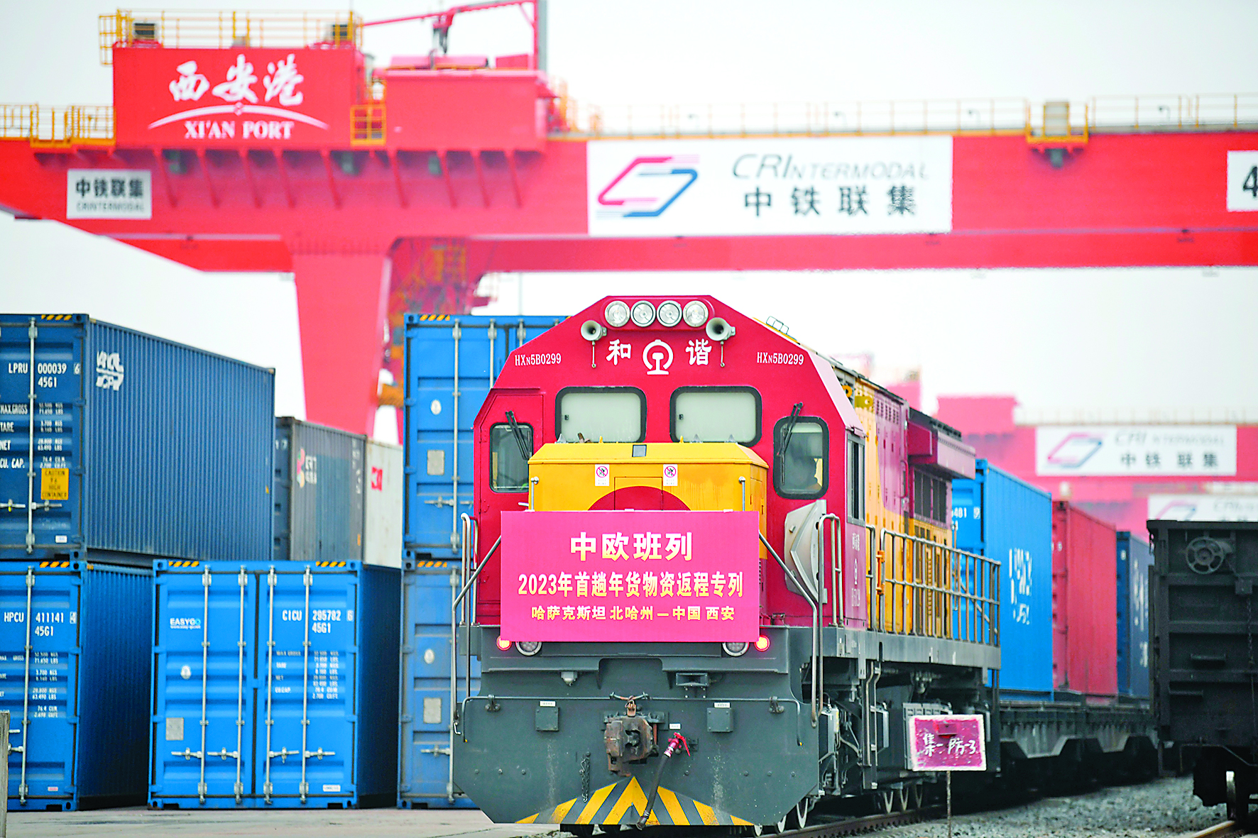 当日上午,满载着来自哈萨克斯坦1300吨面粉的中欧班列驶入西安国际港站货场,标志着2023年首趟中欧班列年货物资返程专列顺利抵达西安,为即将到来的春节拉来了“洋年货”。