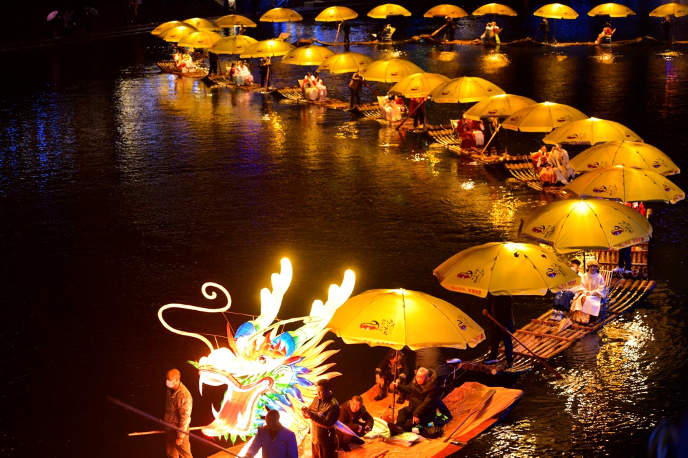 1月14日,人们在体验“贡水游龙”。 当日,在湖北省恩施土家族苗族自治州宣恩县贡水河上,一场“贡水游龙”迎新春活动吸引不少市民游客参与体验。“贡水游龙”由数十条竹筏作“龙身”,辅以灯光、音乐,人们可以在贡水河上“乘龙”观赏璀璨夜景,欢乐迎新春。新华社发(宋文 摄)