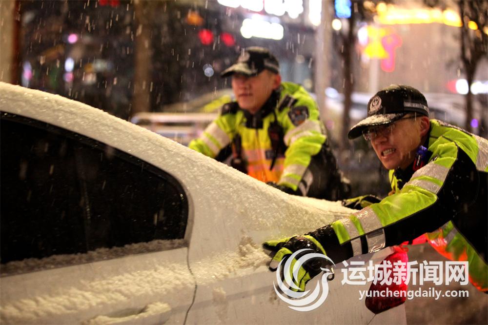 市公安局盐湖分局交警大队民警冒雪救助受困车辆。 葛崇收 谭建春 摄