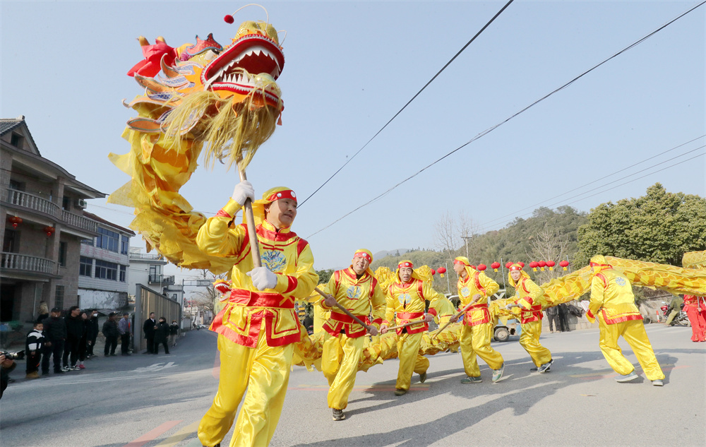 1月19日,浙江省湖州市德清县莫干山镇的村民在表演舞龙。