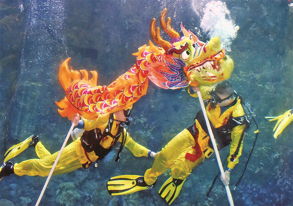 1月18日,潜水员在进行“海底舞龙”表演。春节临近,青岛极地海洋公园在春节期间推出了“海底舞龙”和水下拜年等贺新春活动,迎接农历新年的到来。 新华社记者 李紫恒 摄