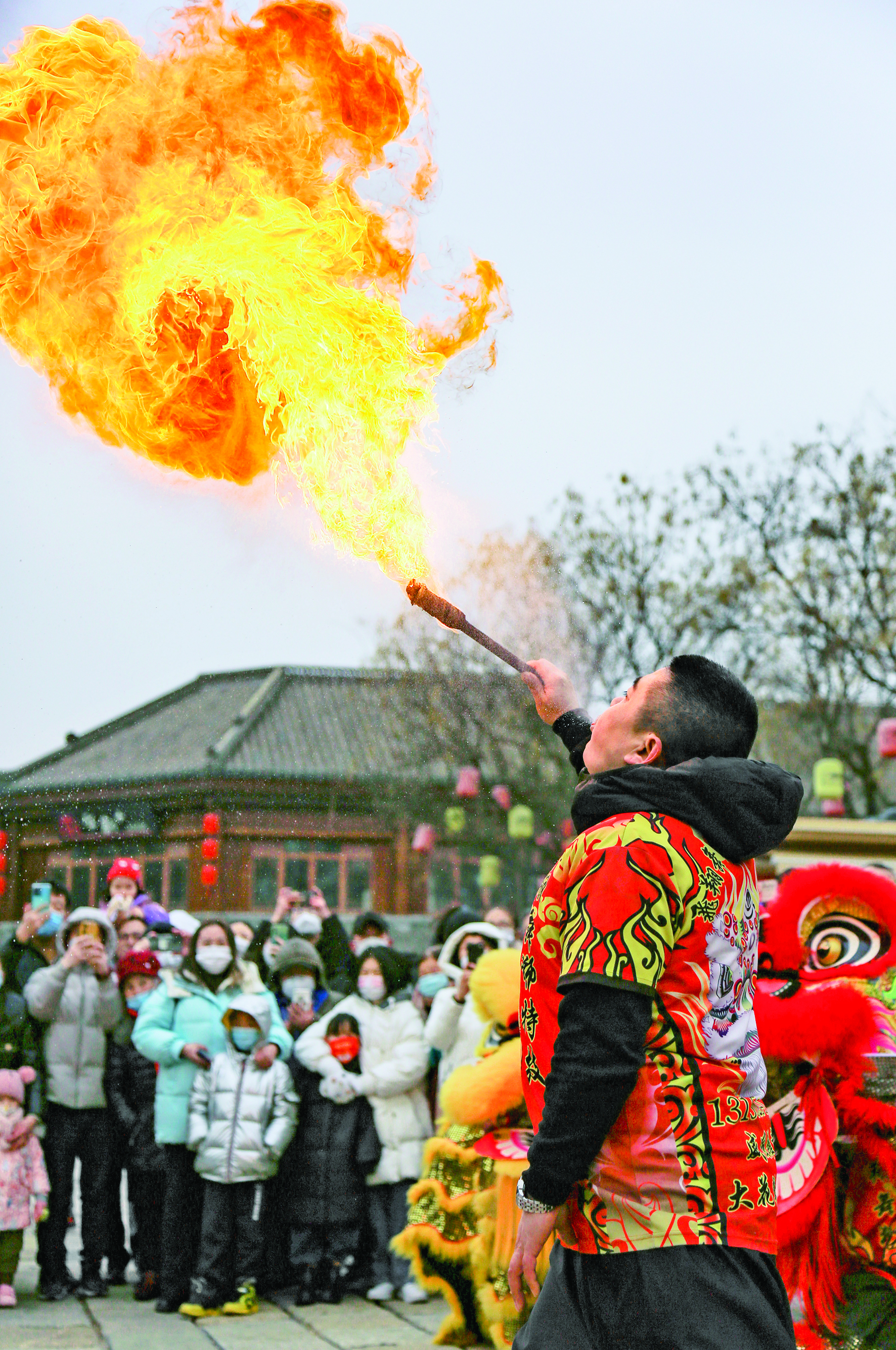 1月26日,民间艺人在山东省青岛市即墨古城表演“喷火”。 当日,山东省青岛市即墨古城举行主题为“品年味、闹新春”的民俗展演活动,当地的民间艺人欢聚古城表演舞龙、舞狮、旱船等传统节目,在喜庆的氛围中为市民和游客奉上文化盛宴。 新华社发(张光明 摄)