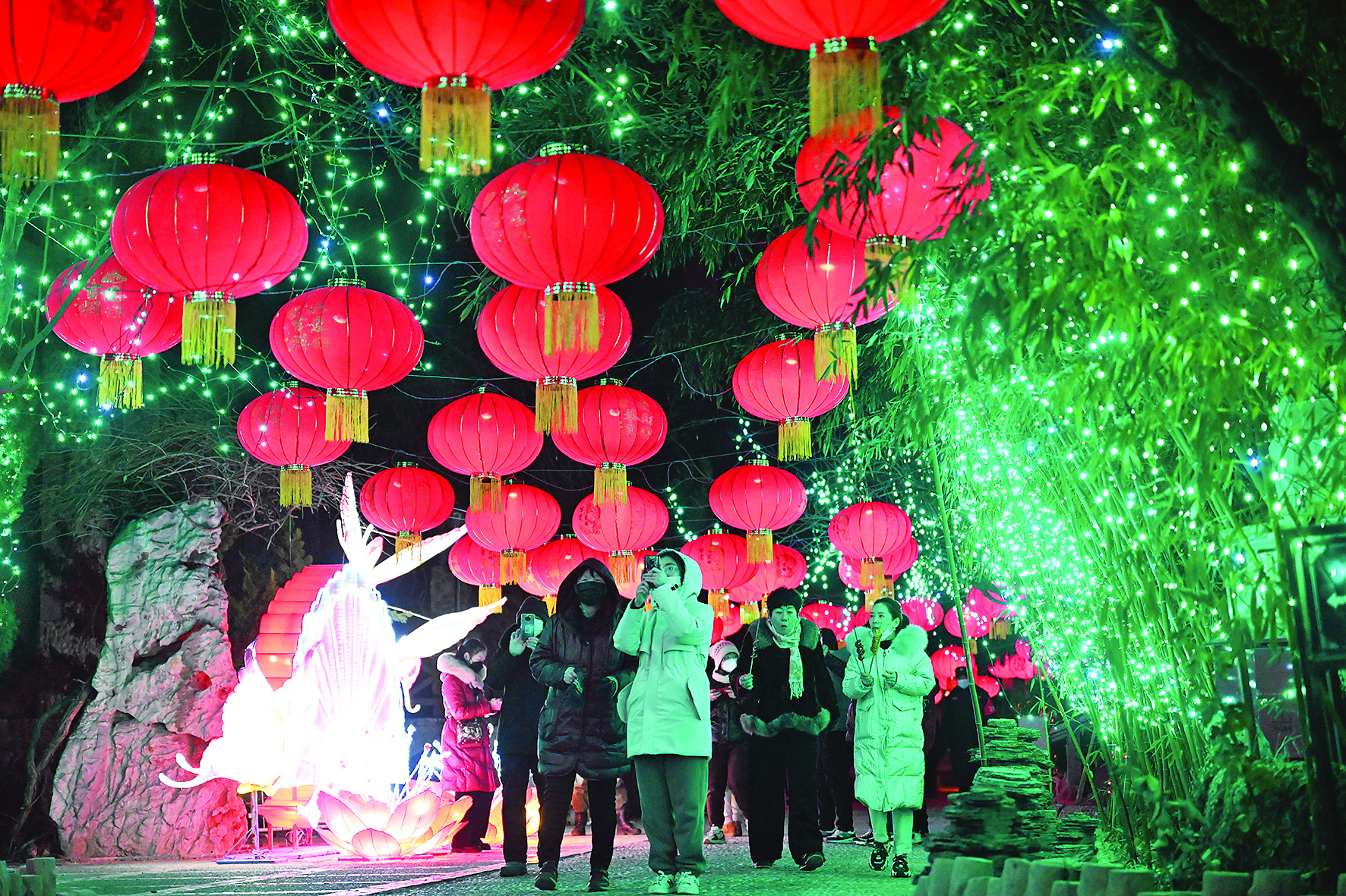 春节期间,天津中华石园景区举办的新春民俗灯会吸引了众多游客。夜幕降临后,融合兔子、二十四节气等元素的各式彩灯结合现代光影变得惟妙惟肖、活灵活现。市民及游客在此赏灯游玩、“打卡”拍照,感受节日氛围。 新华社记者 赵子硕 摄