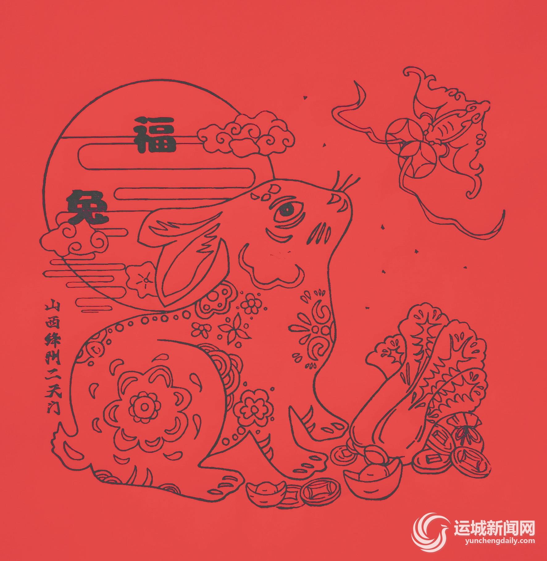 早在几个月前,国家级非物质文化遗产保护项目绛州木版年画省级代表性传承人吴百锁就开始准备癸卯兔年的非遗作品。“《福兔》年画的木刻制作、印刷、着色就达两个多月,为了赶春节订单,从凌晨工作到深夜也是常事。”一把把刻刀、立刀、挖刀在吴百锁手腕翻转间,一块块雕版就成形了,《福兔》尽在画中。吴百锁用棕刷饱蘸墨汁,均匀刷往雕刻好的木版,再将一张红纸轻轻覆在其上,然后用趟子从中心部位向四周趟平,自红纸一角轻轻提起,一只兔子便跃然纸上。在刀与木的碰撞下,墨与纸的交融中,传承千年的非遗技艺就呈现在一张张年画中。画面中,一只蝙蝠,口衔两枚镂空古钱,自上向下展翼飞来,寓意福在眼前、福从天降,兔年财源滚滚。