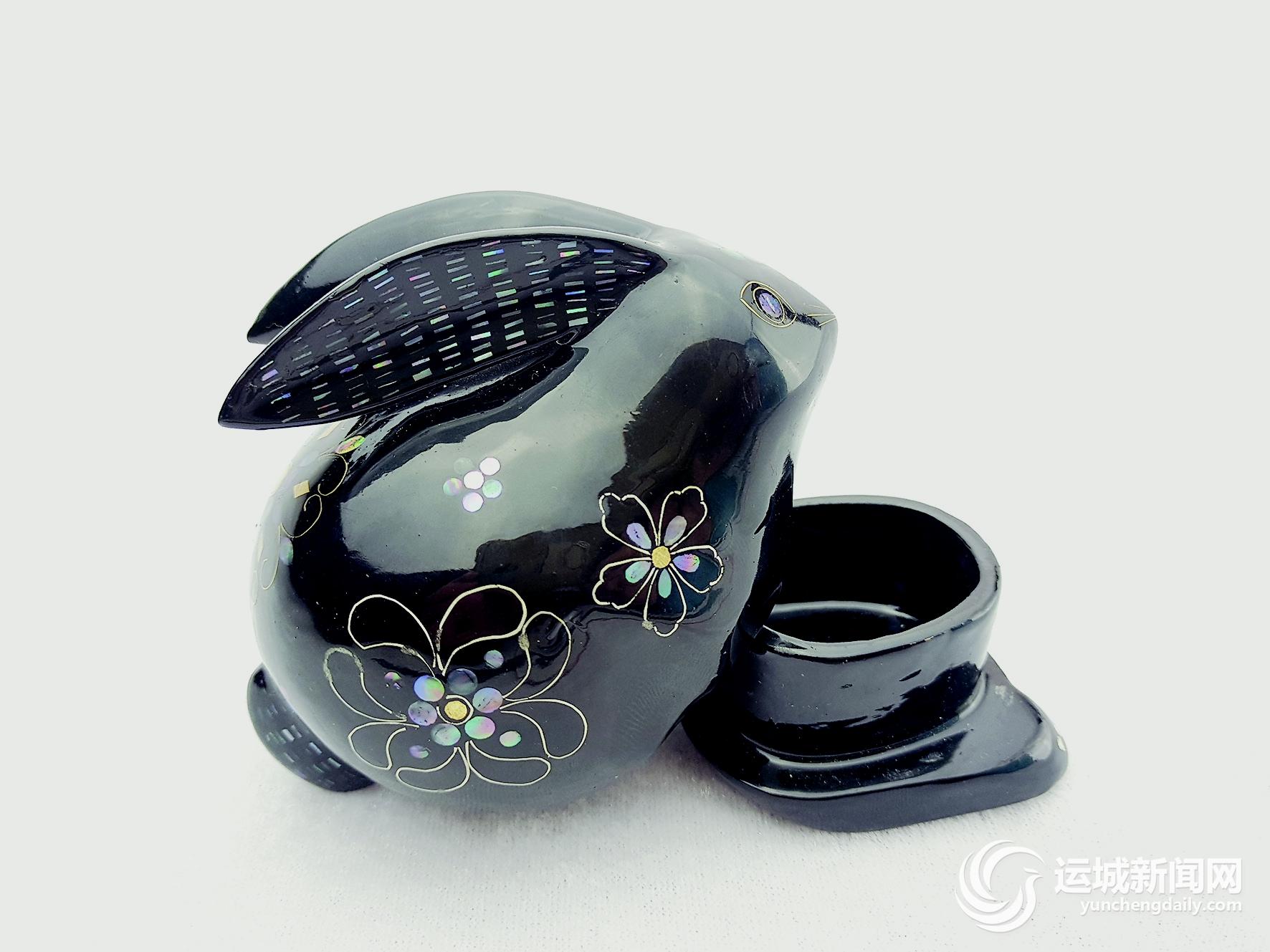 国家级非物质文化遗产稷山螺钿漆器髹饰技艺省级代表性传承人马静也在为“兔元素”与漆器的巧妙融合而花费心力。“如何将漆器生活化是我这次设计作品首先考虑的因素,让更多人可以感受稷山螺钿漆器的美。”马静向记者介绍她为兔年所创作的作品,用精妙、小巧的漆器融合圆滚滚的生肖兔,娇憨中透着几分可爱,同时还能放置戒指一类的小首饰。兔子的眼睛、耳朵、尾巴处选用螺钿点缀,五色纷纶,平添几分灵动,薄如蝉翼、细如秋毫的钿片以牡丹花的样式装饰在兔子周身,身形张力随彩而施,光华可赏。“它通体浑圆,镶嵌就是最大的难点,因为用到的金属线条和螺钿都是平面的,要镶嵌上去是不太容易的,但是我们把它定位成旅游纪念品的作品,就是想让每个人都能了解稷山螺钿漆器,都能拥有它,都能在兔年大‘绽’宏‘兔’。用年轻人的话语叫我们要在2023年绽放,所以兔子身上髹饰的是绽放的牡丹花,寓意富贵吉祥,叫瑞兔贺春。”马静介绍说。