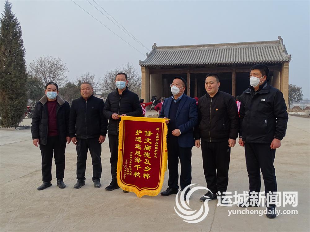 运城晚报讯(记者 刘亚)近日,永济市卿头镇三娄寺村党支部将一面写有“护遗迹恩泽千秋 修文庙德及乡梓”的锦旗送给永济市文物保护中心,感谢他们对三娄寺村关帝庙的保护修缮。