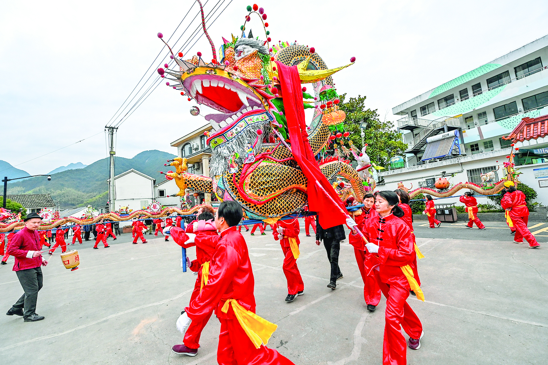 2月1日,浙江省杭州市富阳区湖源乡窈口村女子板龙队在湖源乡集镇上进行板龙舞龙表演。