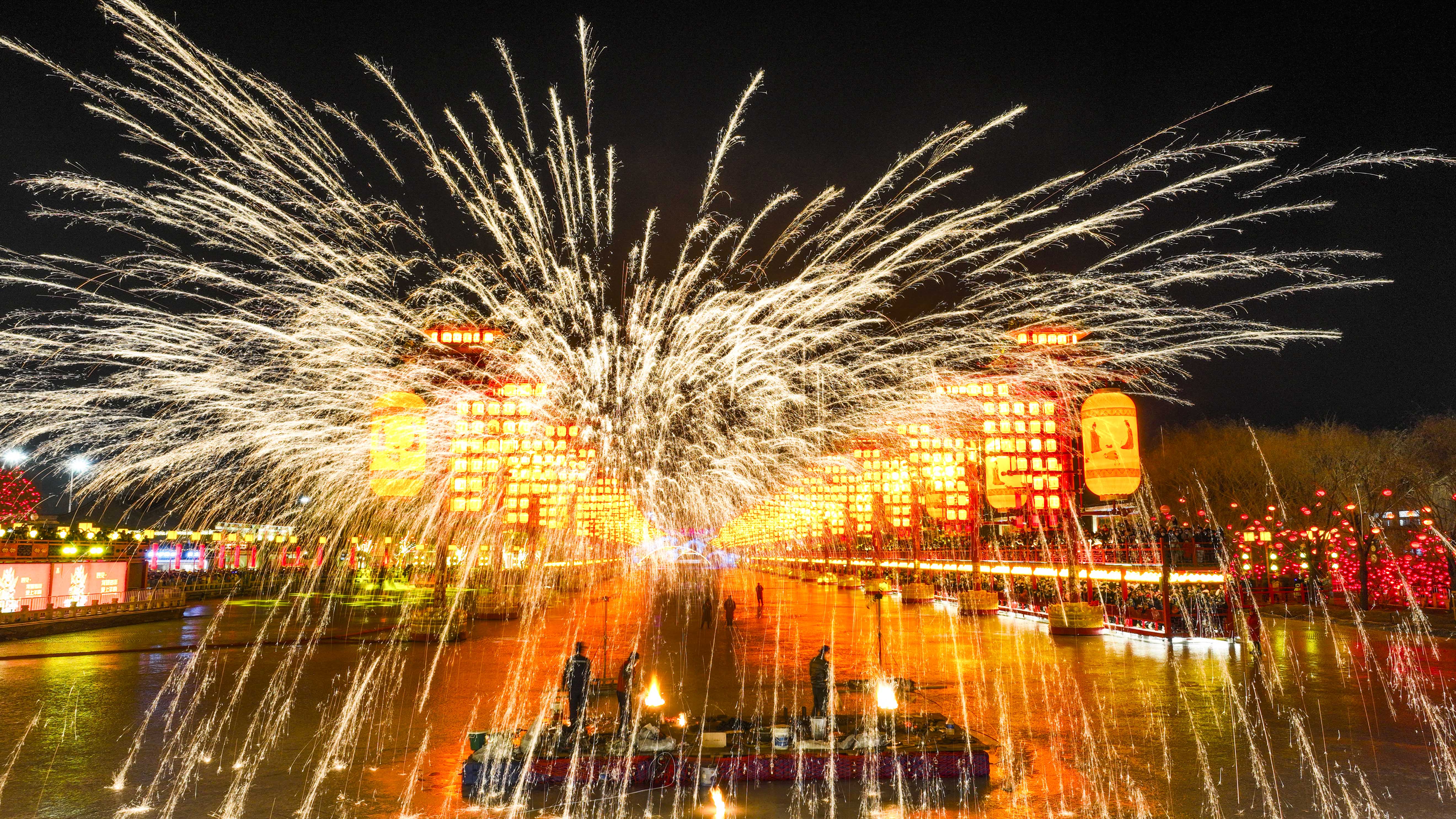 当晚,河北省唐山市丰南区河头老街景区火树银花,耀眼夺目。民间艺人表演的打铁花,吸引游客驻足观看。 新华社发(刘满仓 摄)